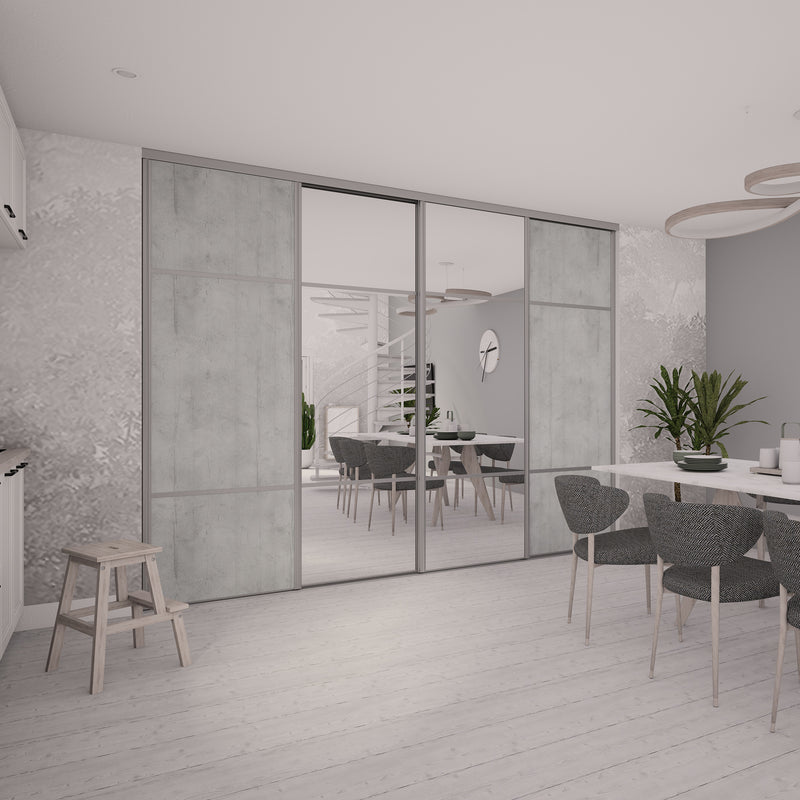 Façade de placard coulissante 4 portes décor béton wood, miroir argent