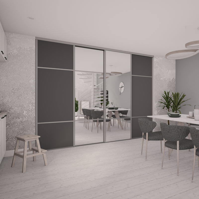 Façade de placard coulissante 4 portes décor gris anthracite, miroir argent
