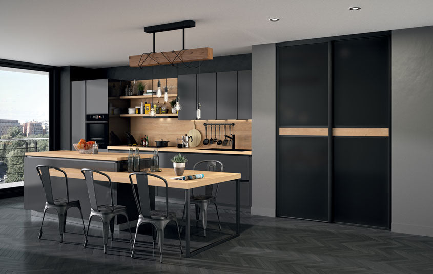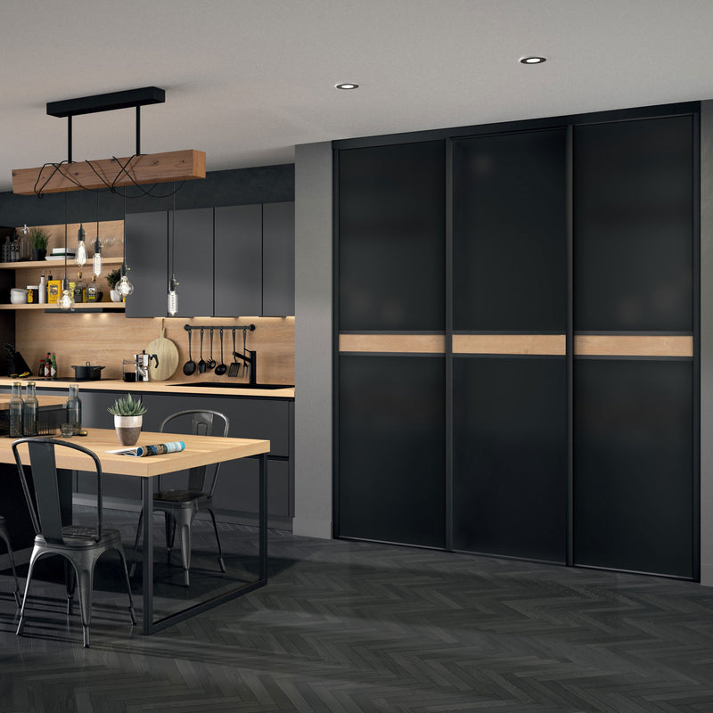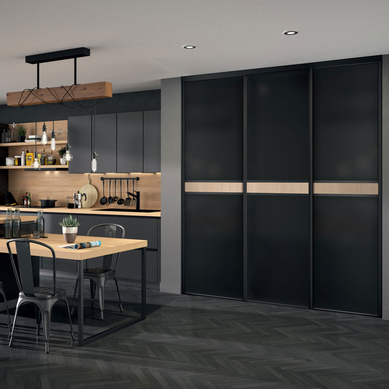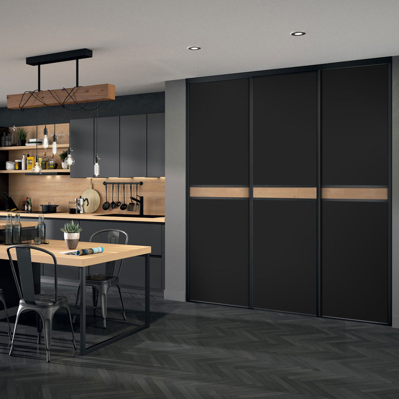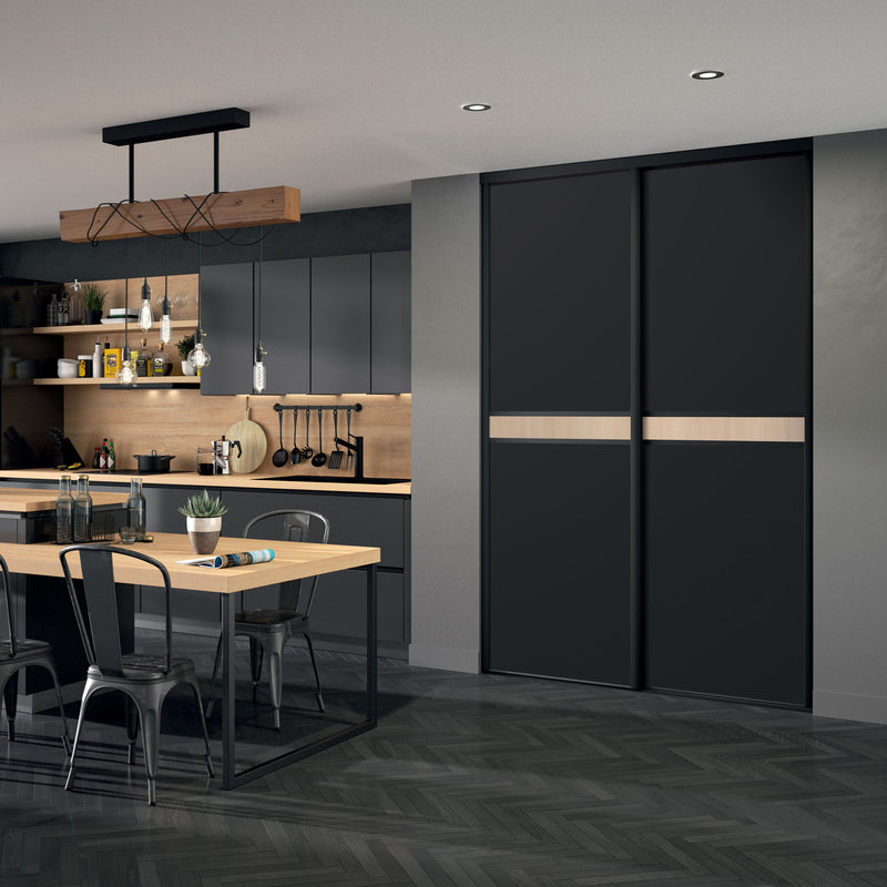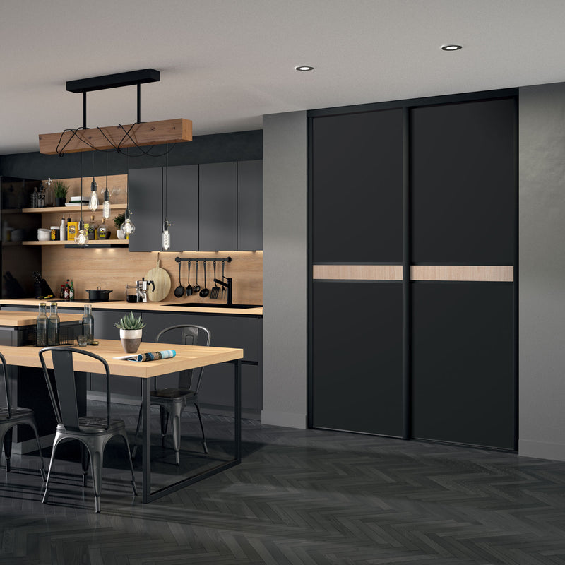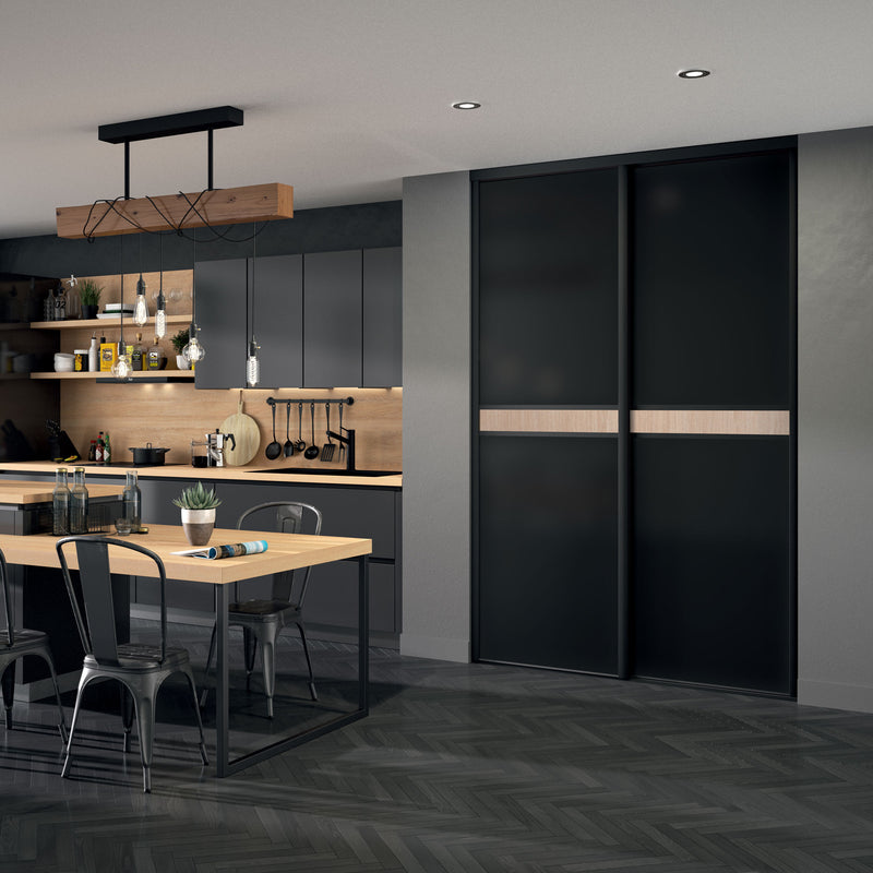 Craquez pour cette Collection chic et chaleureuse de façades de placard coulissantes. Elle associe l’intensité du noir à l’authenticité du bois clair à travers une frise centrale qui séquence élégamment la composition.