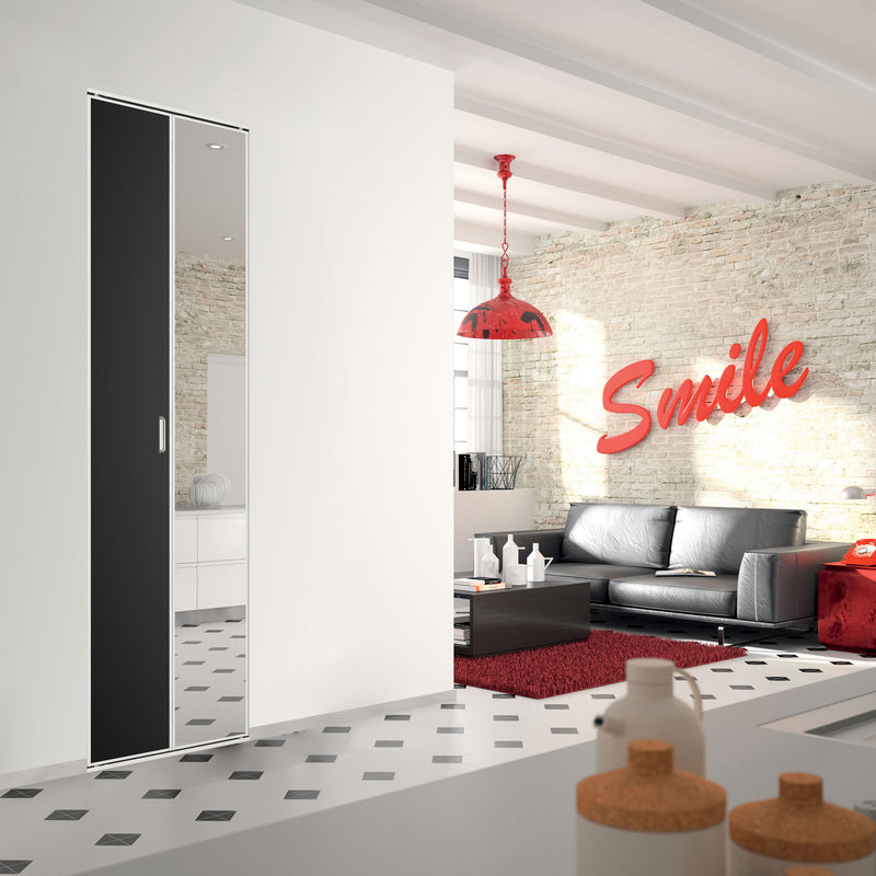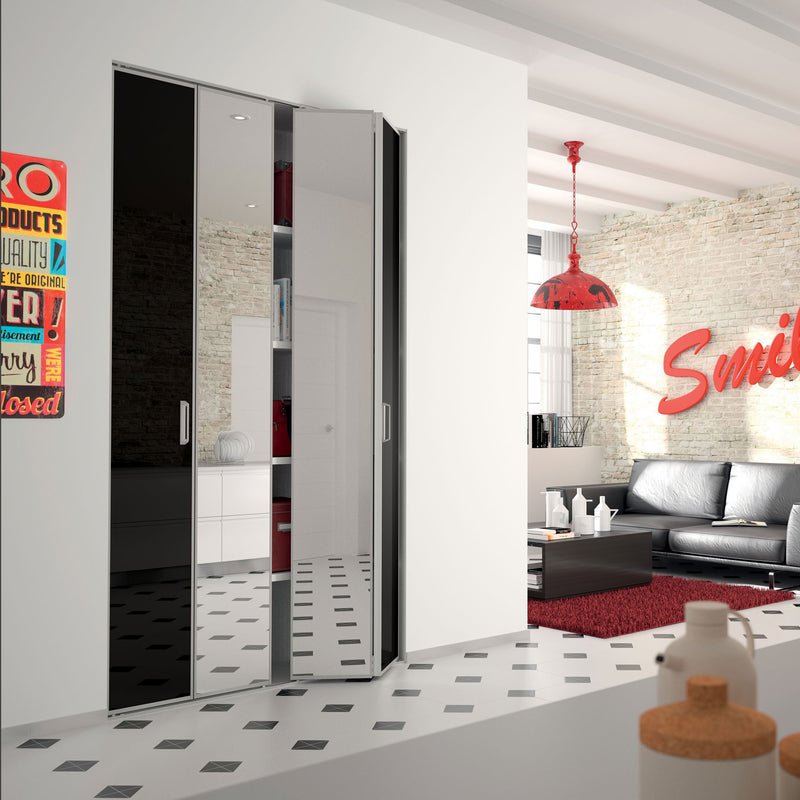 Façade de placard pliante 1 porte verre laqué noir, miroir argent