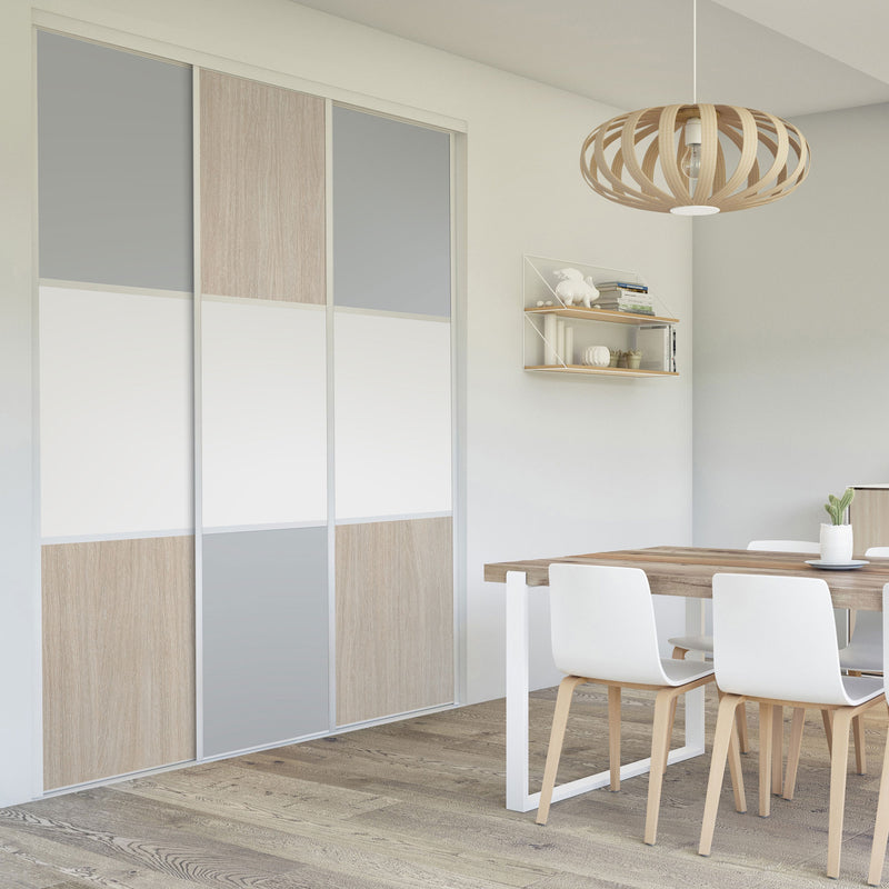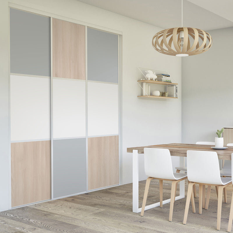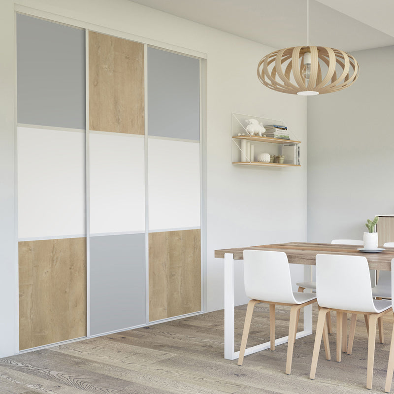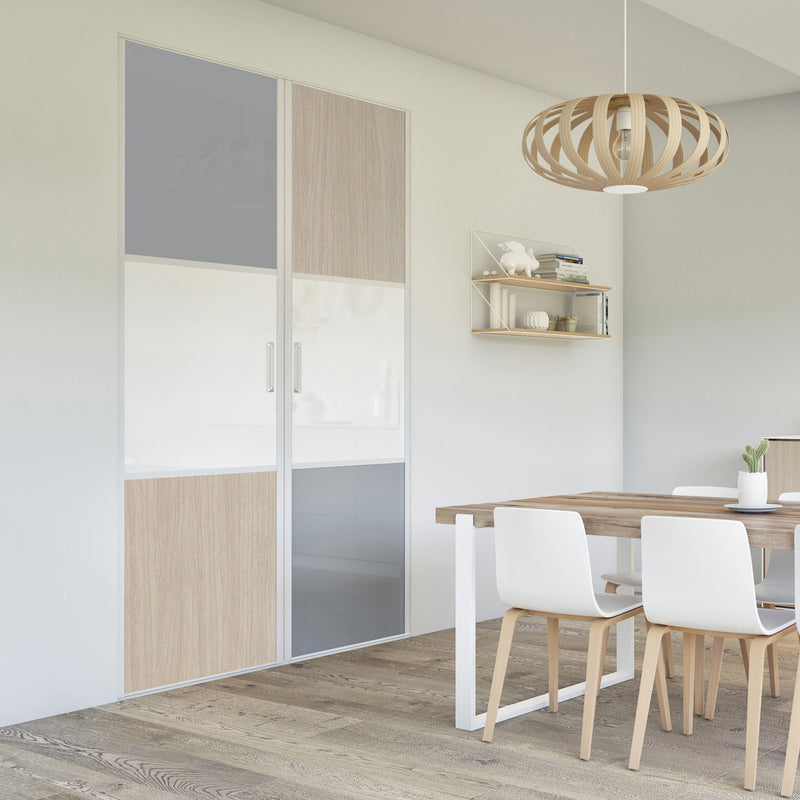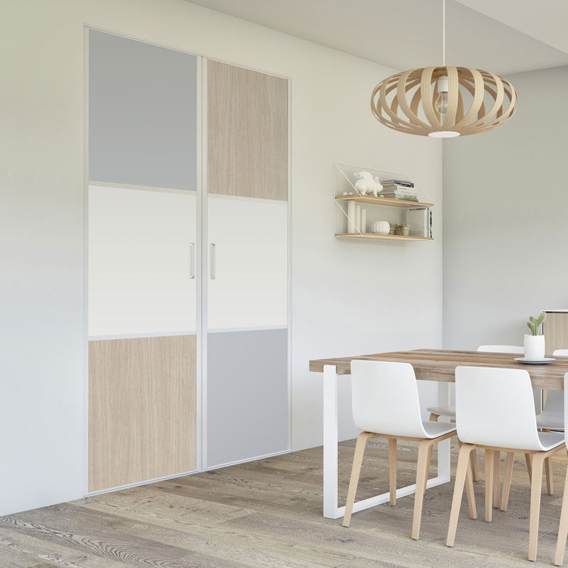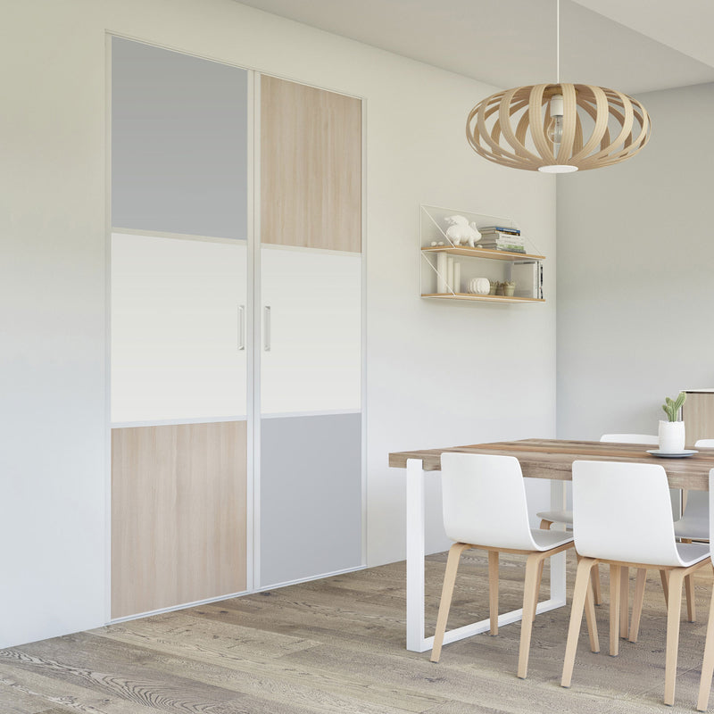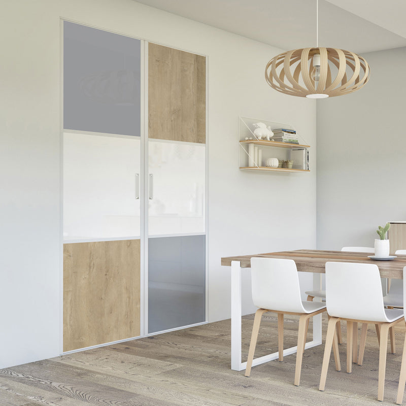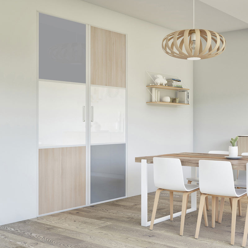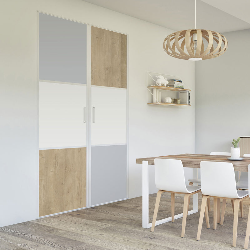 Pour un intérieur tendance et chaleureux, on adopte le style scandinave et cette Collection Minsk qui y trouvera parfaitement sa place. Elle mixe des tons bois clairs, doux et authentiques, à des couleurs neutres et intemporelles, le blanc et le gris. La composition en damier de ces portes coulissantes et pivotantes apporte une touche graphique et originale et la finition en alu Blanc mat sublime l’ensemble.