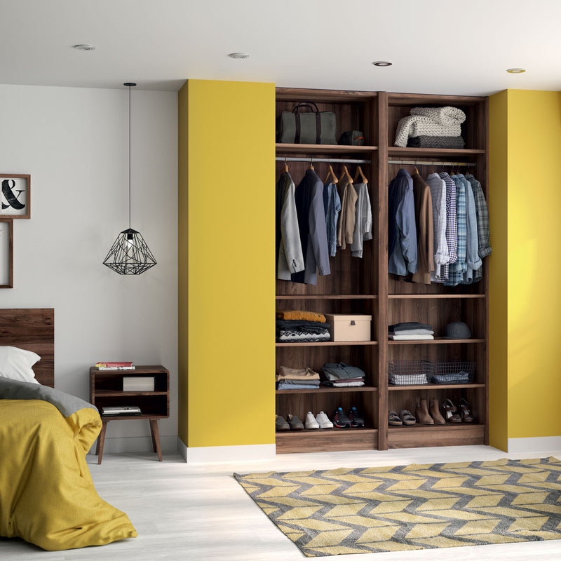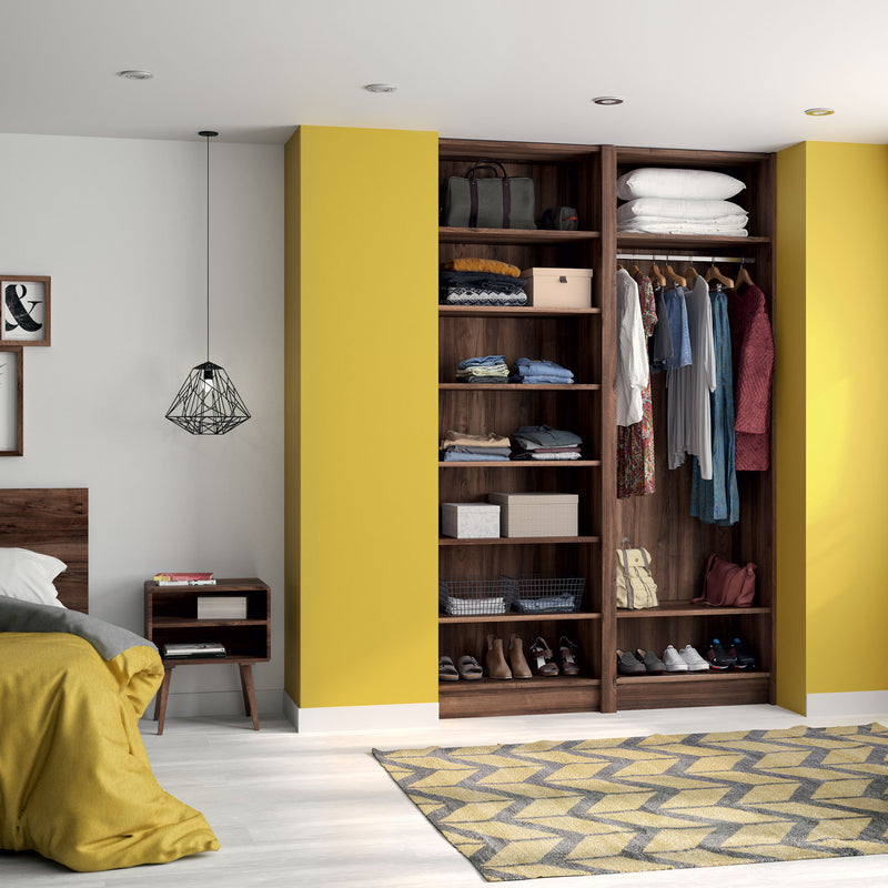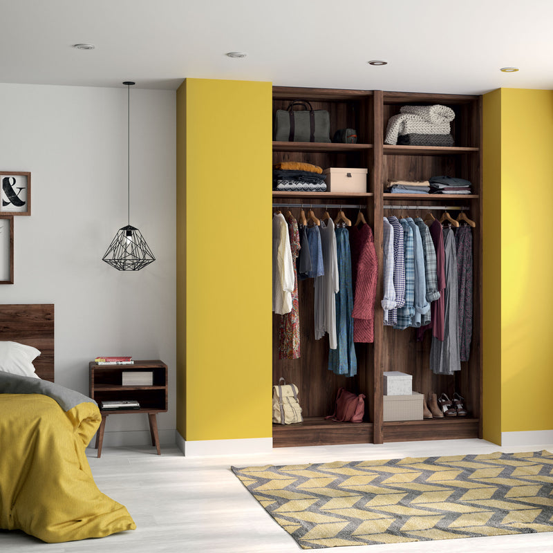 Aménagement 2 espaces, profondeur 465 mm, Noyer des Andes, 2 tringles - 4 étagères - 2 tiroirs