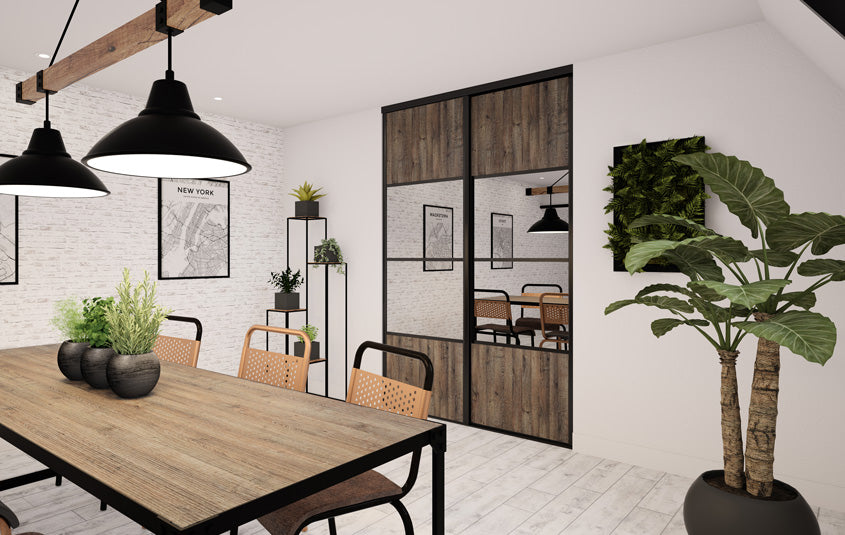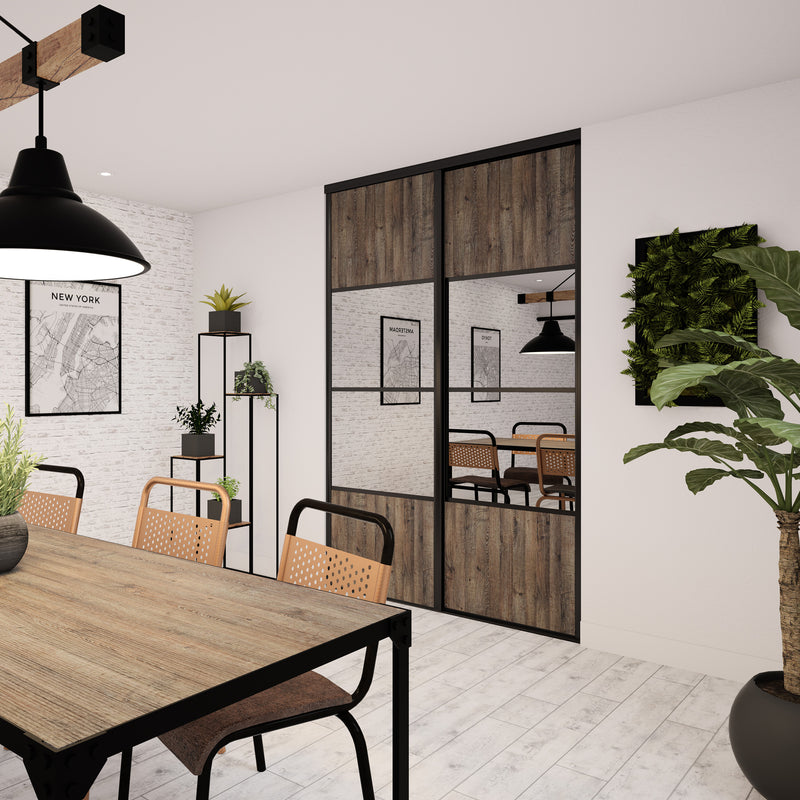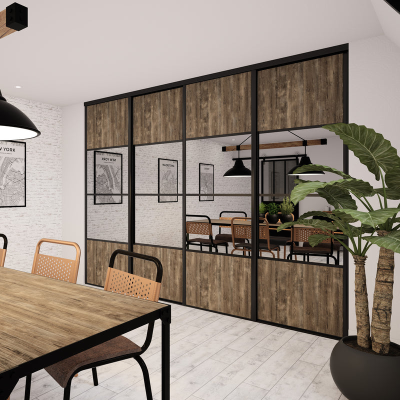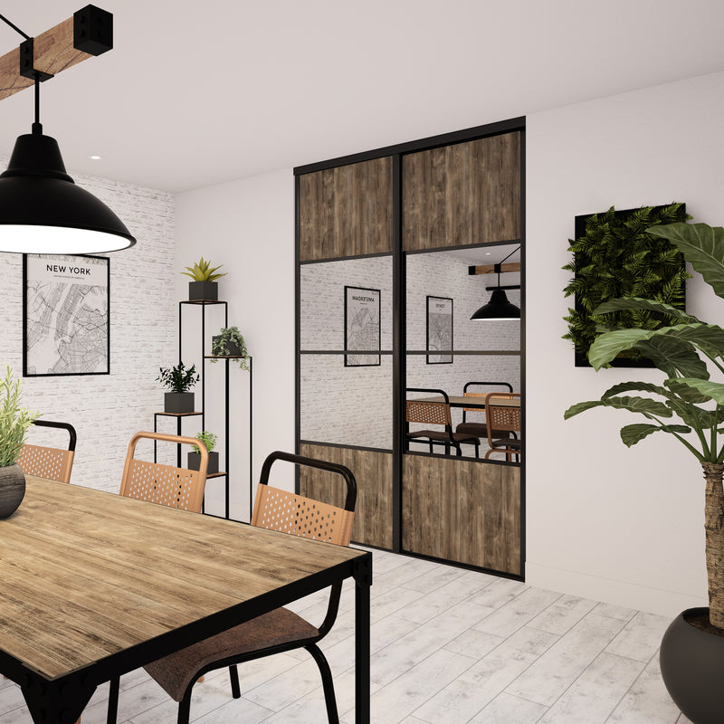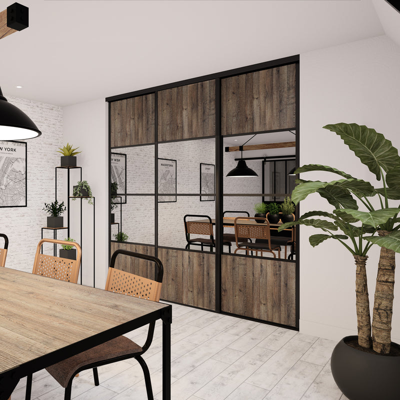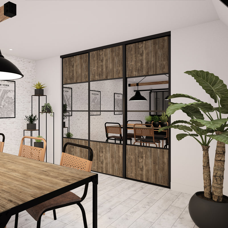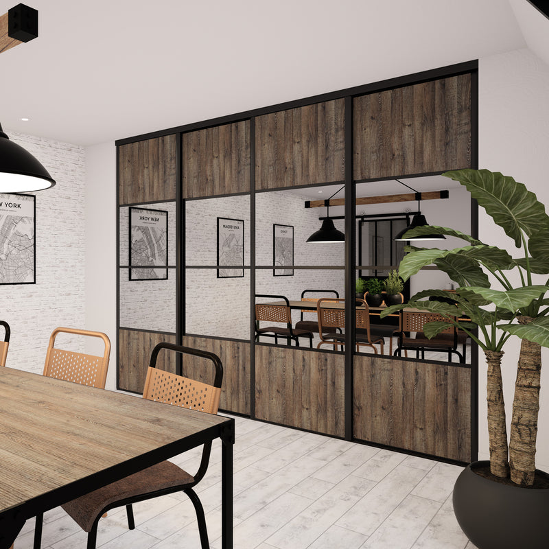 Le style Industriel n’en finit pas de faire des adeptes. La collection de portes coulissantes Rock en est une digne représentante. Le bois effet Capanna brun ou Authentique brun de ses décors offre une ambiance rustique et naturelle tandis que les finitions en aluminium noir et le miroir Plomb suggèrent sans équivoque ce style. Et si vous souhaitez une ambiance 100% loft new-yorkais, optez pour le décor intemporel Noir intense. Ces façades coulissantes Kazed sont disponibles en 2,3 ou 4 portes.
