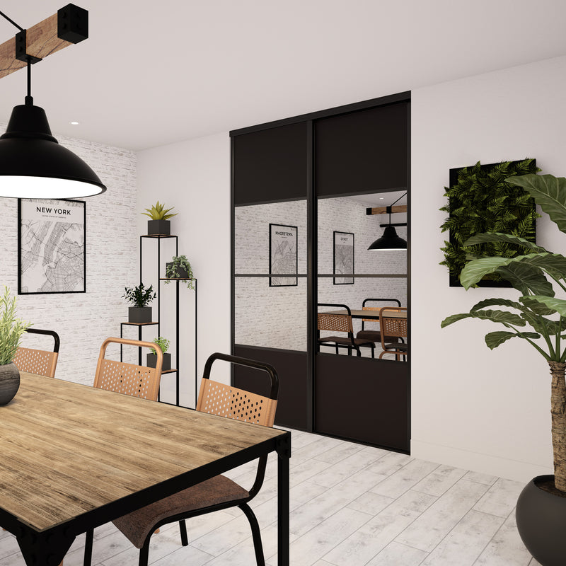 Façade de placard coulissante 2 portes décor noir intense, miroir plomb