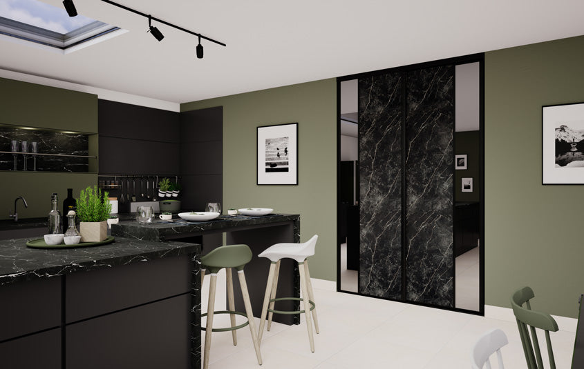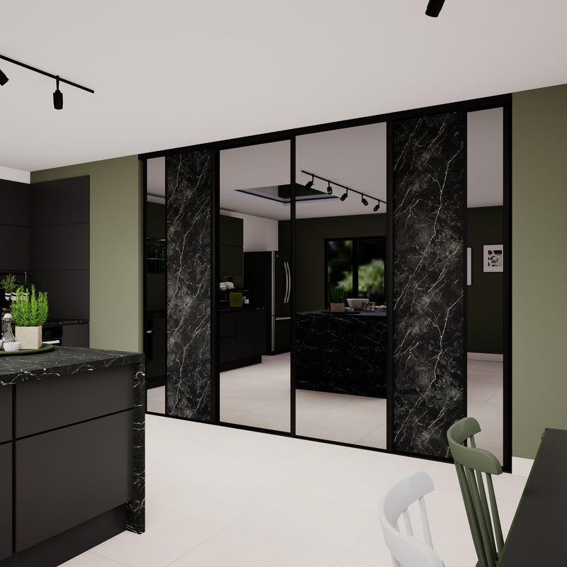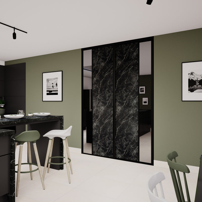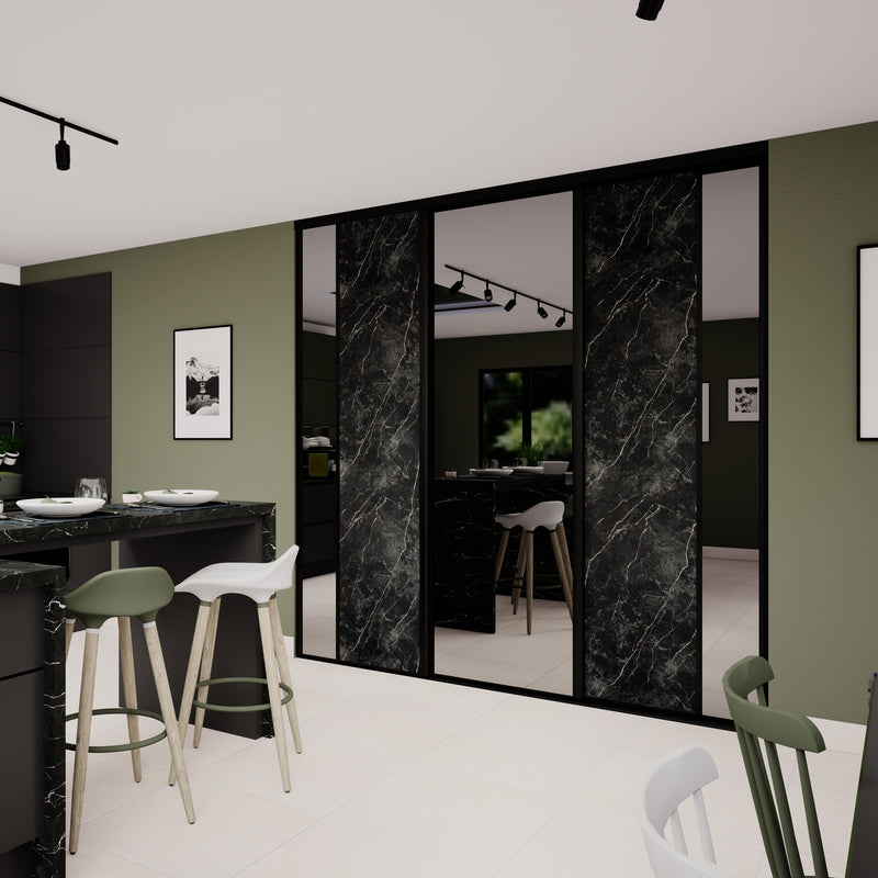 Le raffinement est au rendez-vous avec Stars, une collection de portes coulissantes aux inspirations minérales. Le miroir Plomb, qui agrandira votre pièce, est accompagné d’un aristocratique effet Marbre noir ou d’un élégant décor effet Pierre minérale. Peu importe votre choix, ces façades de placard donneront une touche précieuse voire rare à votre décoration ! L’ensemble est valorisé par des finitions en aluminium Noir mat.