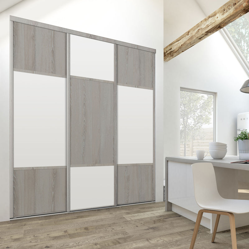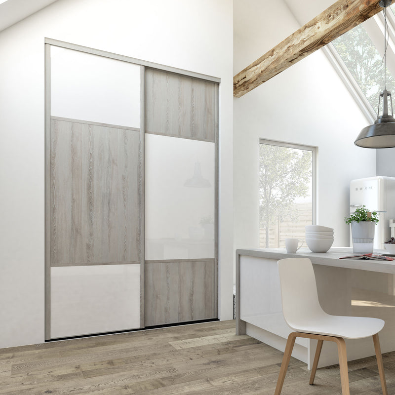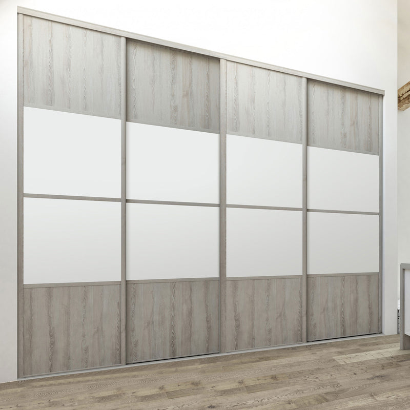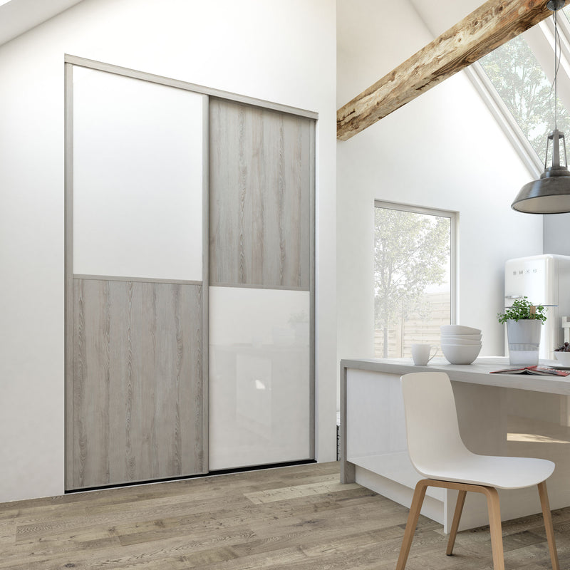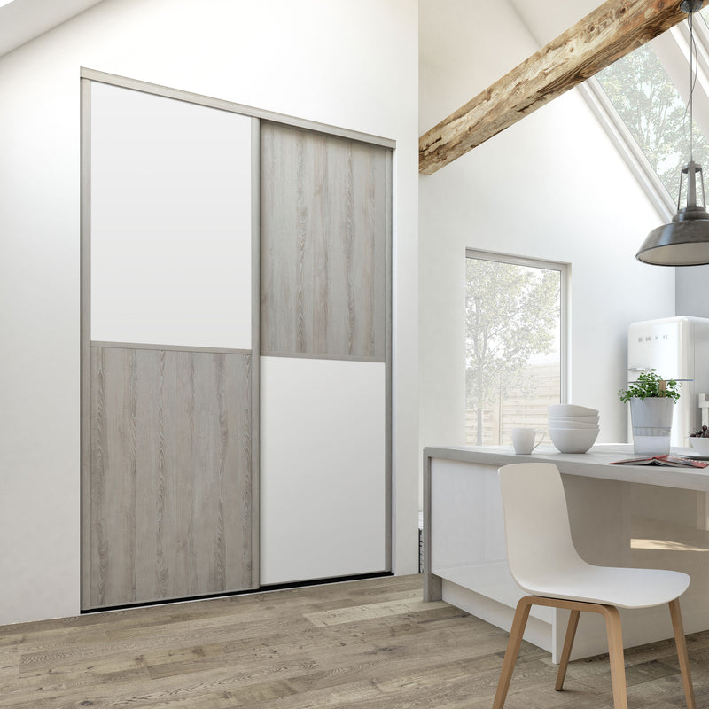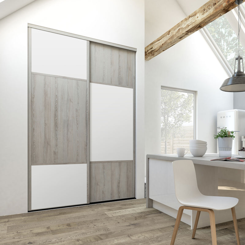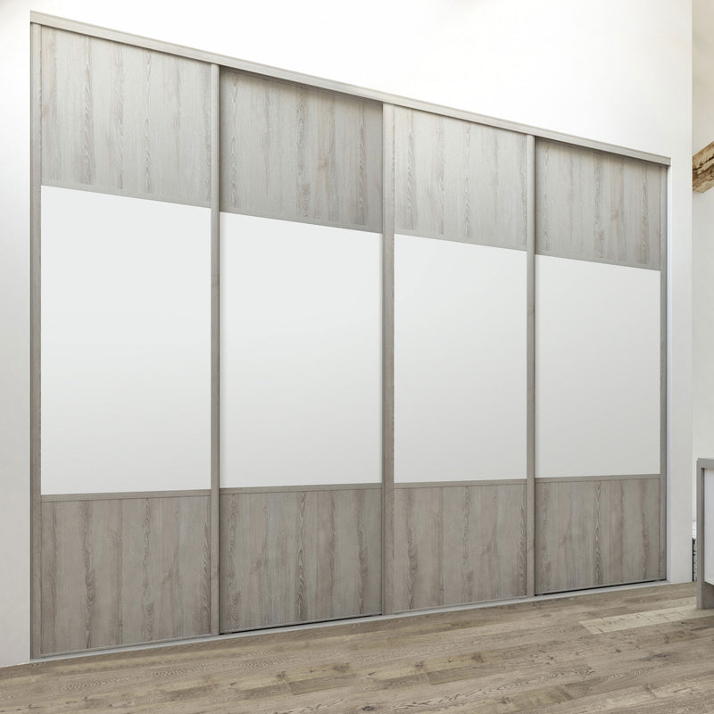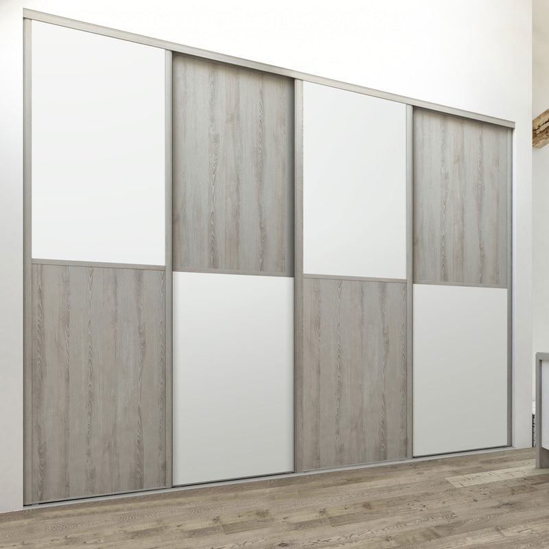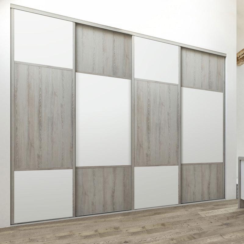 Découvrez cette Collection de portes de placard au style scandinave, mélangeant du bois gris chaleureux à du blanc mat lumineux. Ce contraste très tendance donnera du caractère à votre pièce. Faites votre choix parmi les quatre compositions proposées !