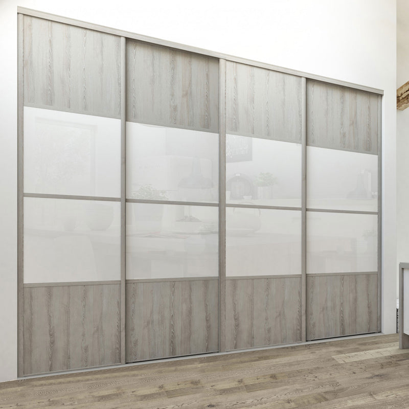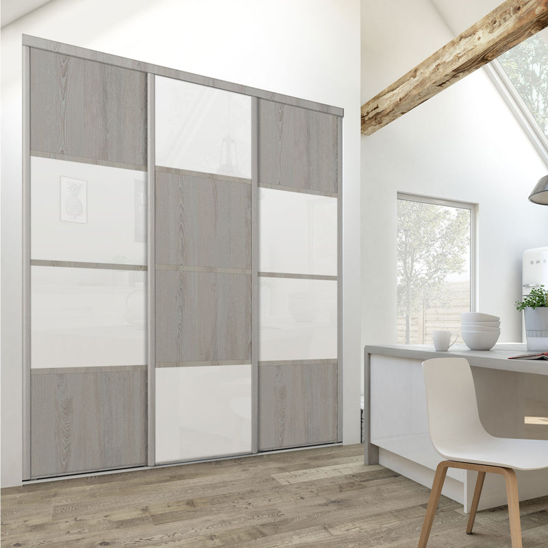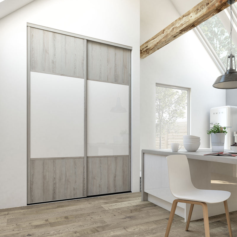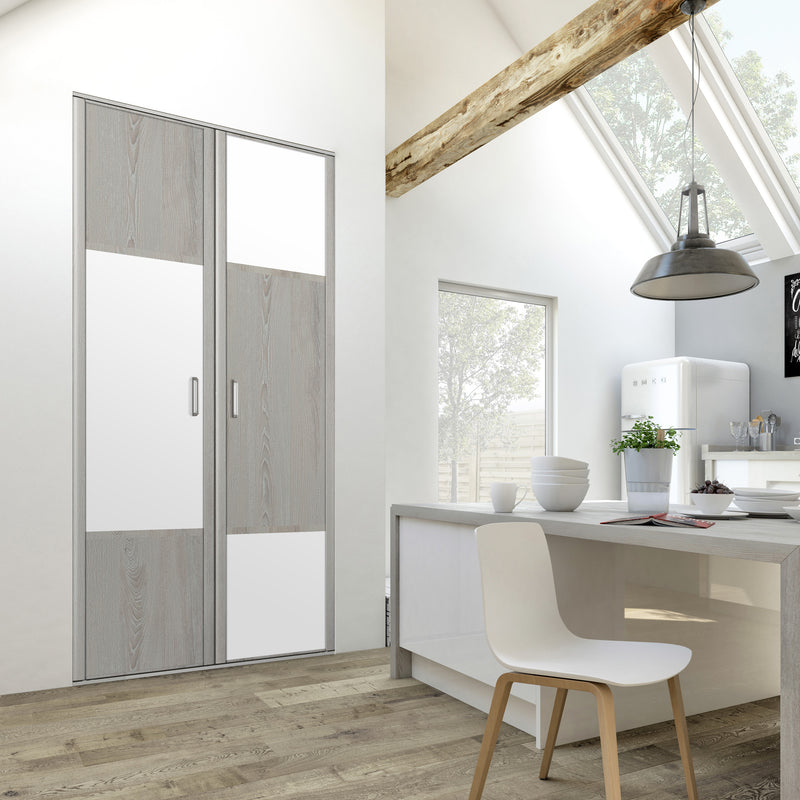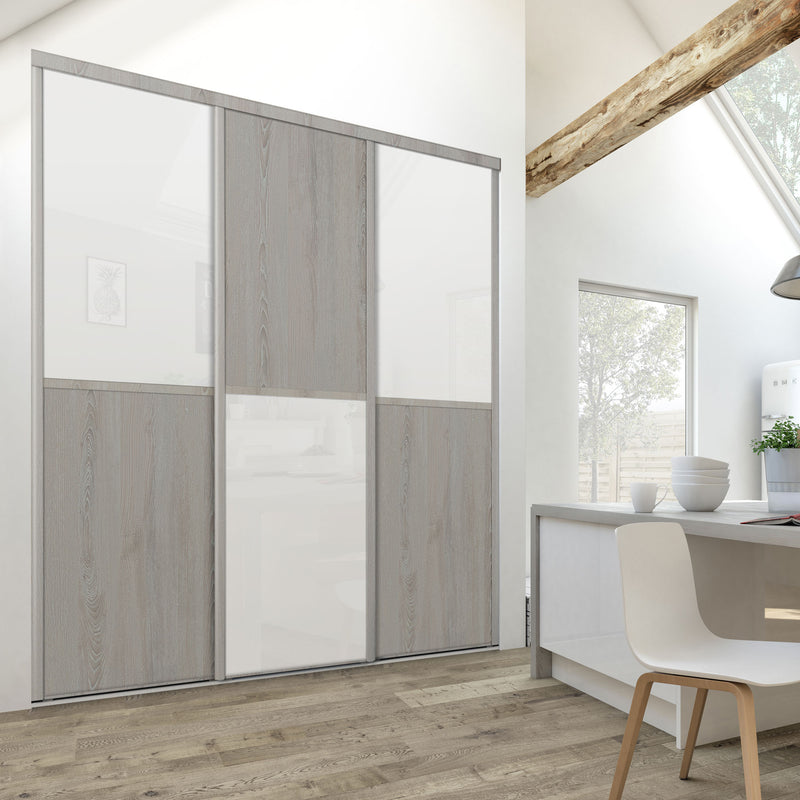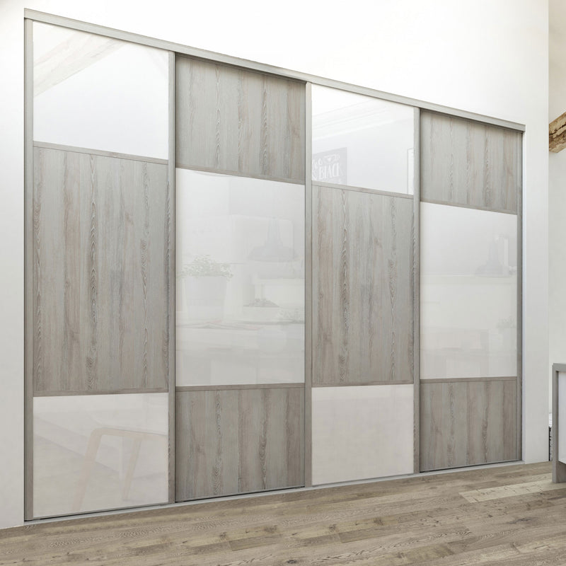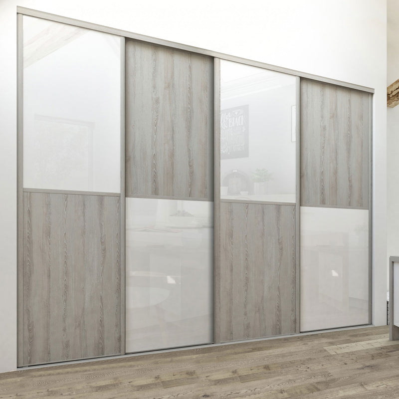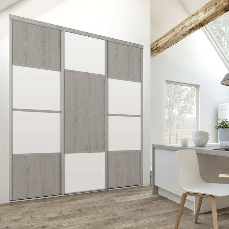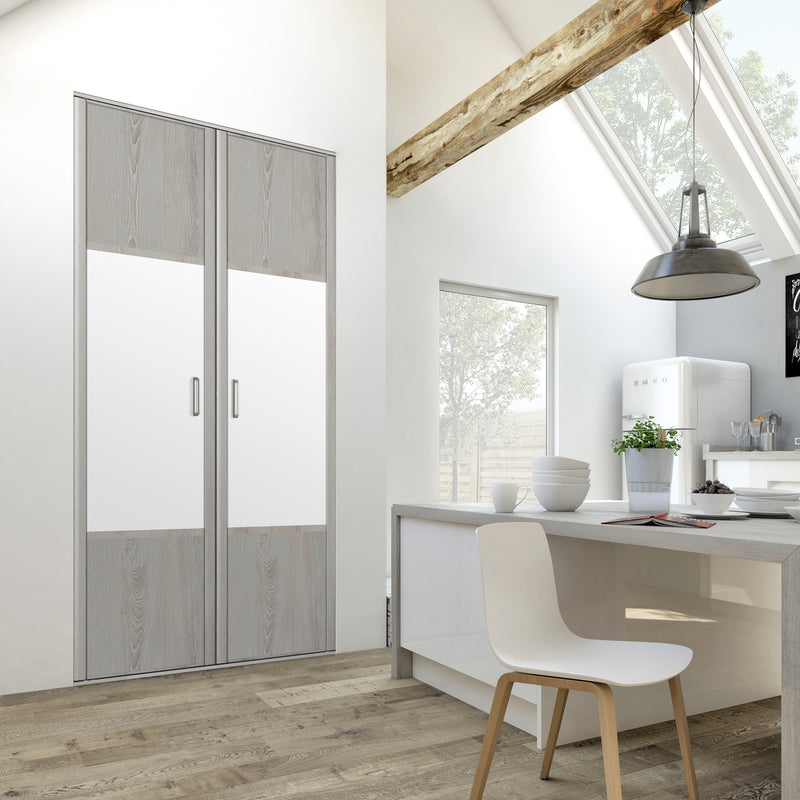 Découvrez cette Collection de portes de placard au style scandinave, mélangeant du bois gris chaleureux à du blanc mat lumineux. Ce contraste très tendance donnera du caractère à votre pièce. Faites votre choix parmi les quatre compositions proposées !