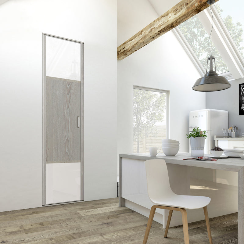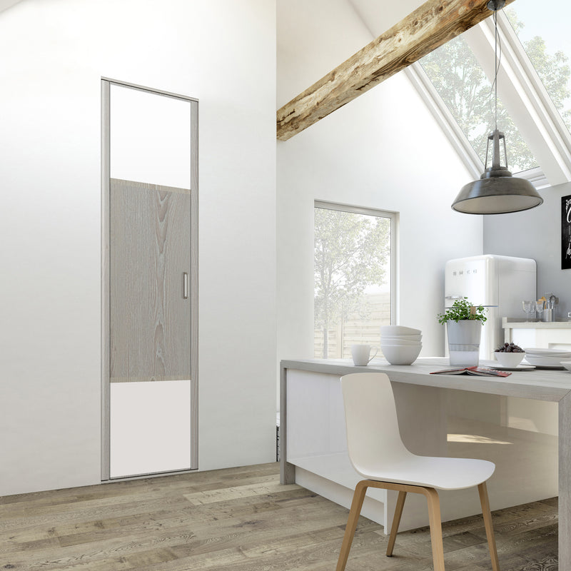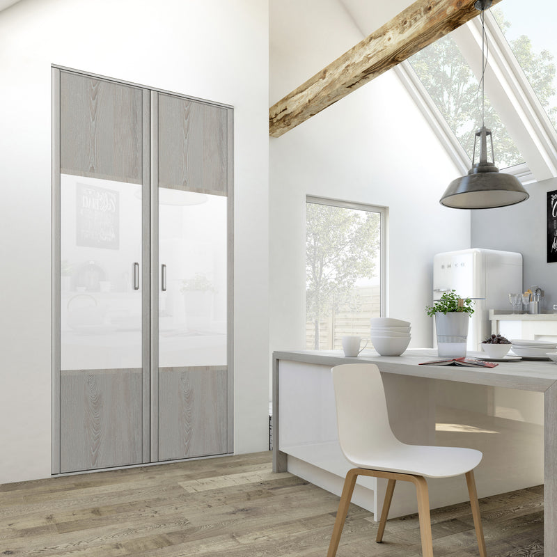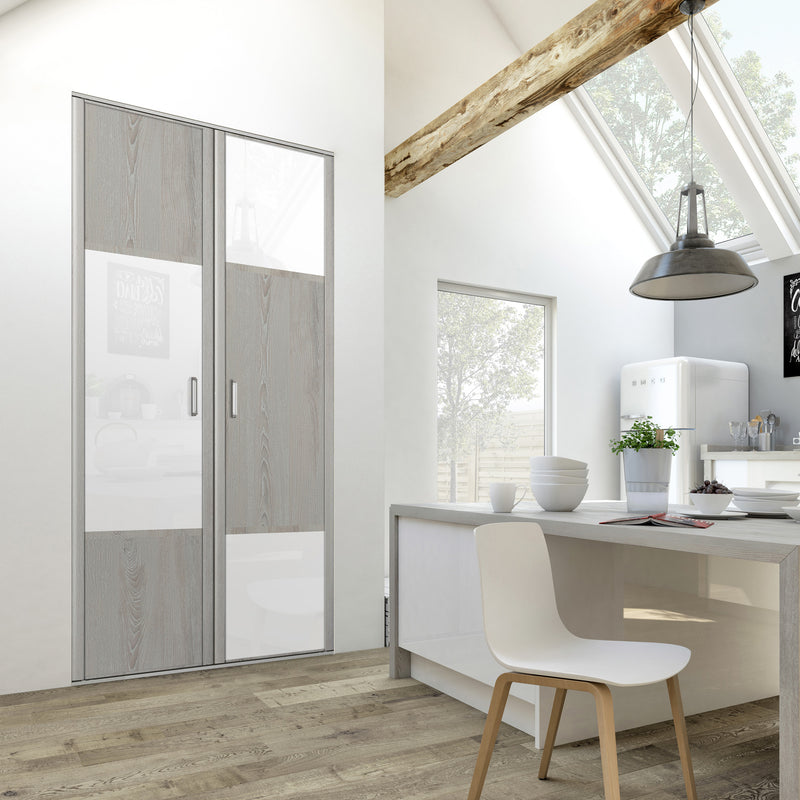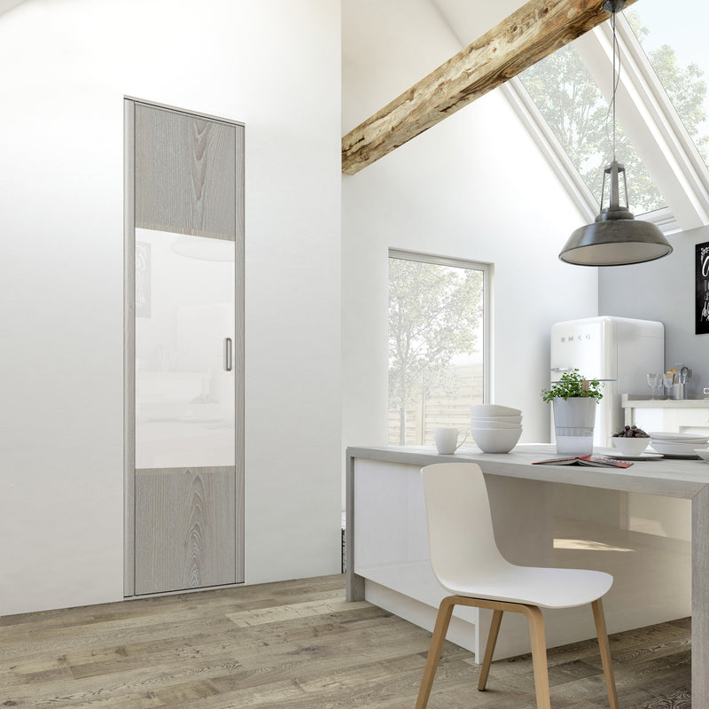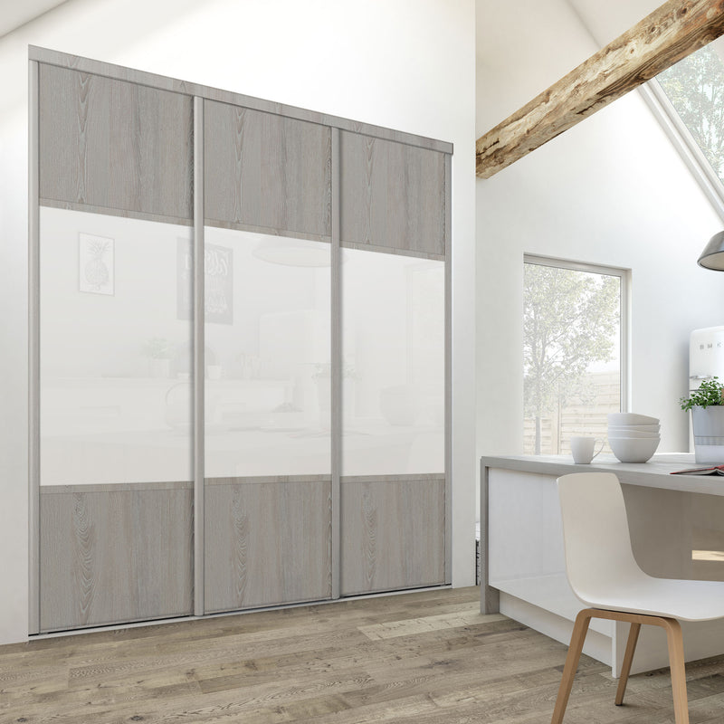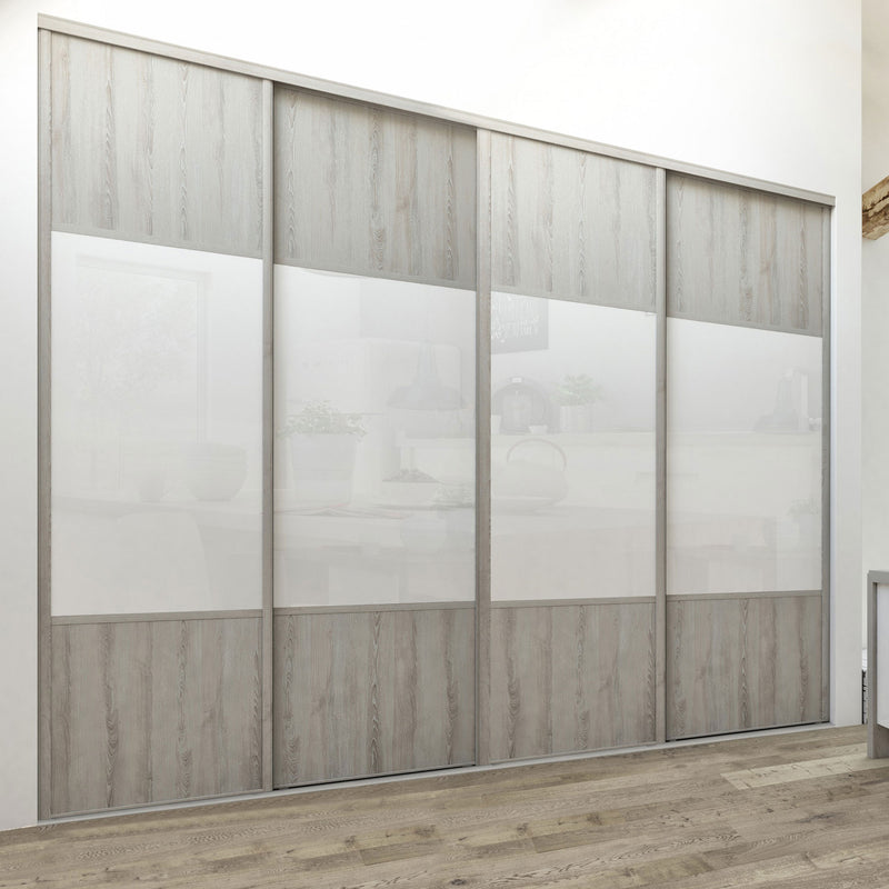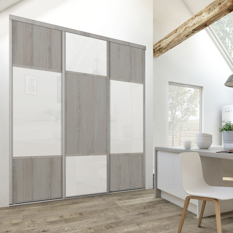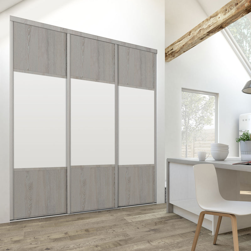 Découvrez cette Collection de portes de placard au style scandinave, mélangeant du bois gris chaleureux à du blanc mat lumineux. Ce contraste très tendance donnera du caractère à votre pièce. Faites votre choix parmi les quatre compositions proposées !
