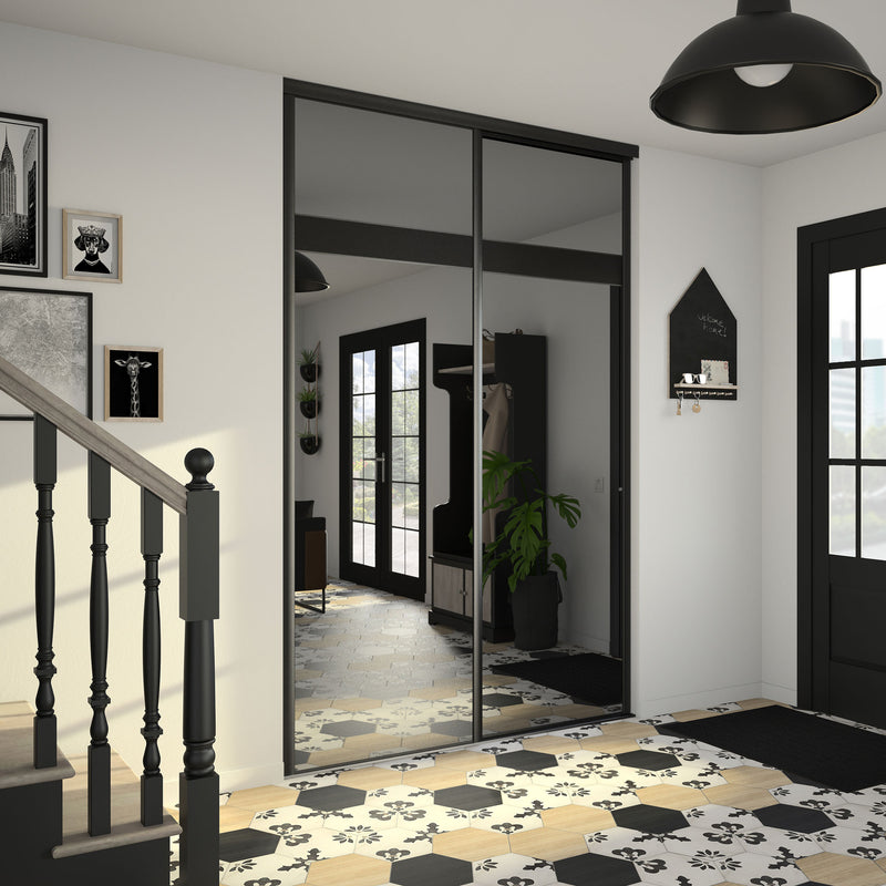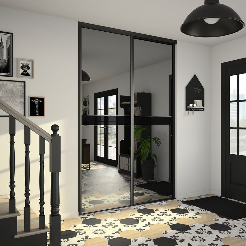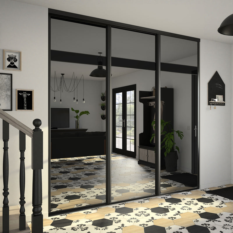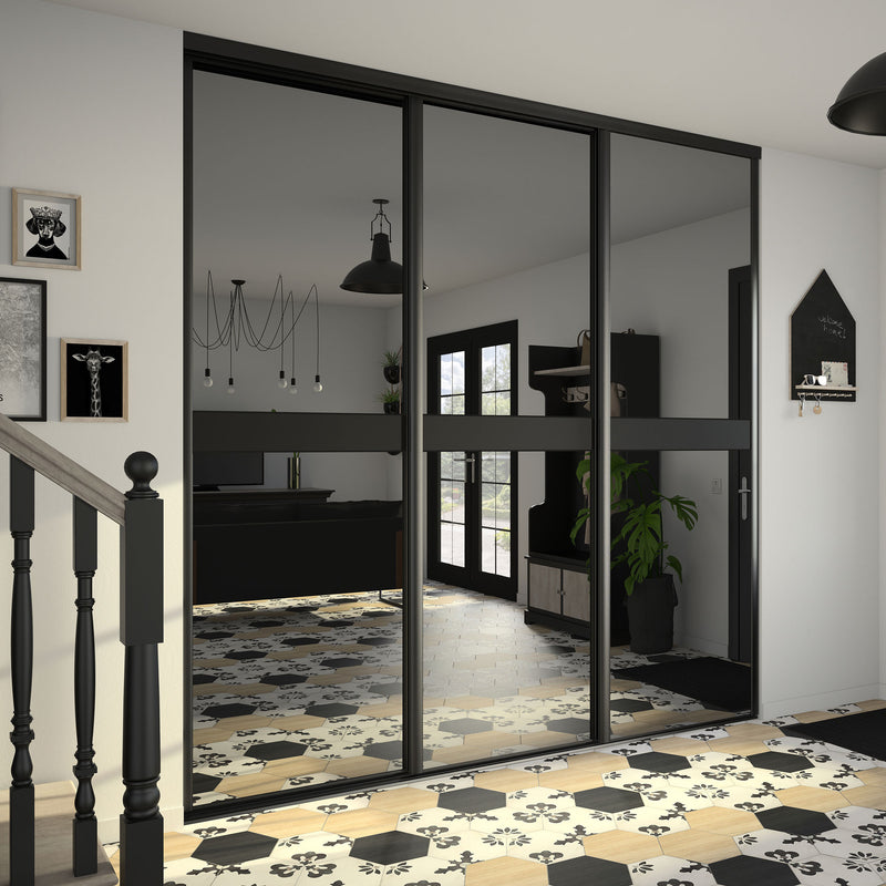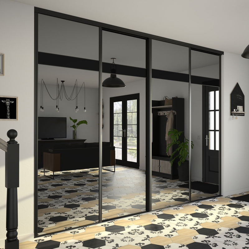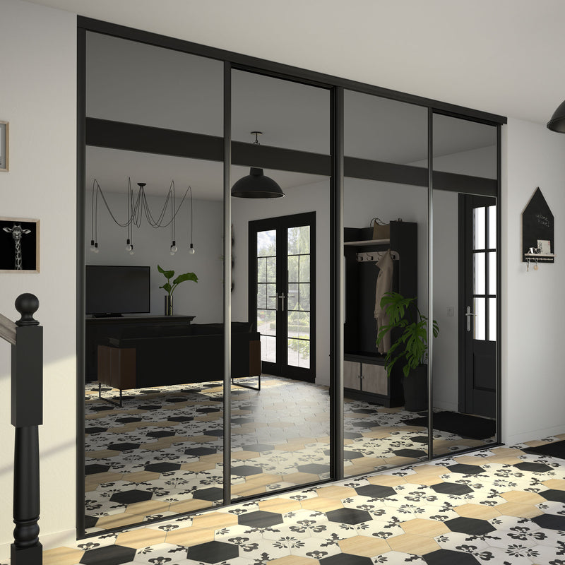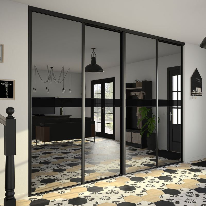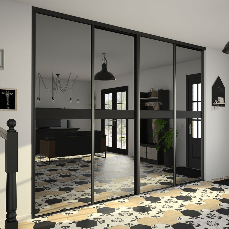 Dans la collection Story Board, le miroir teinté effet plomb est accompagné d’une frise horizontale positionnée soit en haut soit au milieu de la composition. Autre choix qui s’offre à vous, le contenu de cette frise : un Noir intense ou un verre laqué Noir. Dans tous les cas en optant pour cette collection, vous faites le choix de l’élégance et de la luminosité. Les finitions sont en aluminium noir mat. Story Board se décline en 2,3 et 4 portes coulissantes.