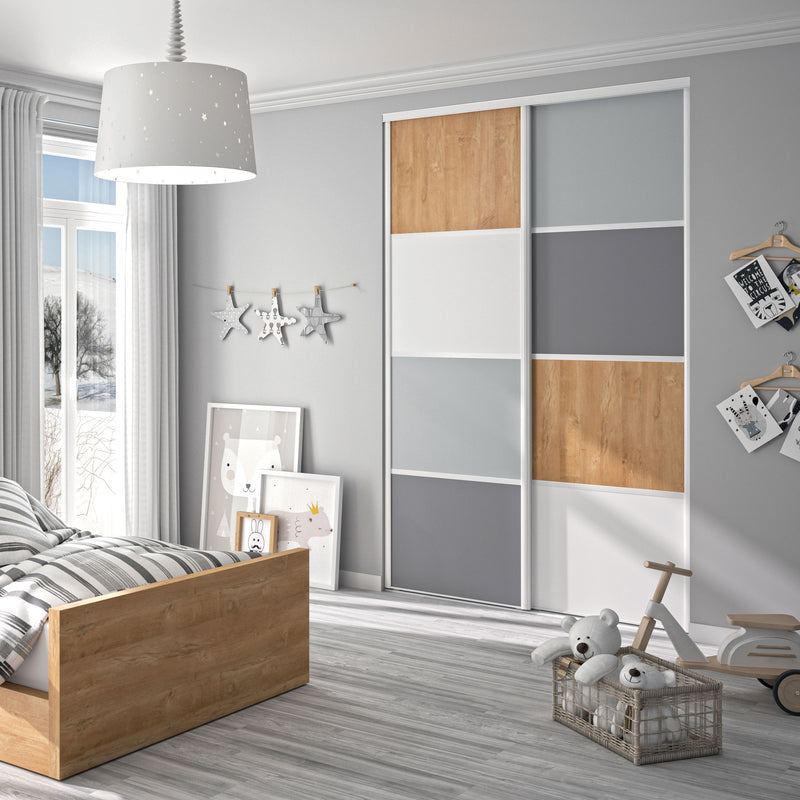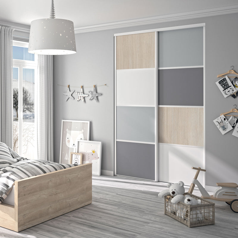 Façade de placard coulissante 2 portes décor gris galet, décor gris intense, décor chêne blond, décor blanc mat