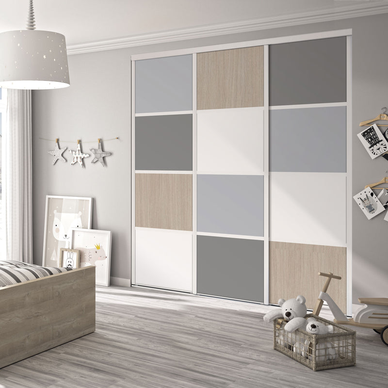 Façade de placard coulissante 3 portes décor gris galet, décor gris intense, décor châtaignier clair, décor blanc mat