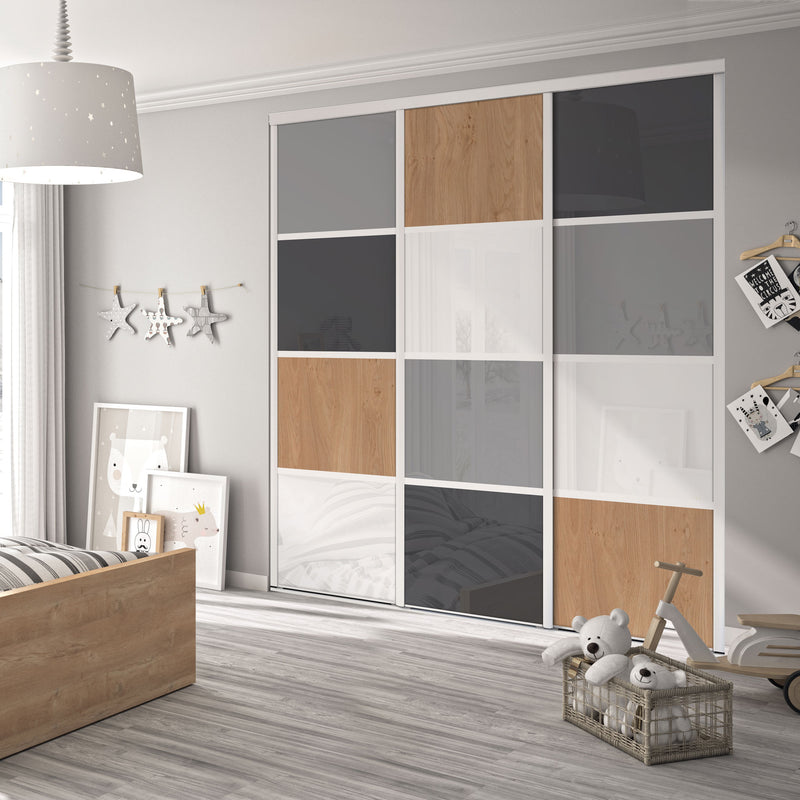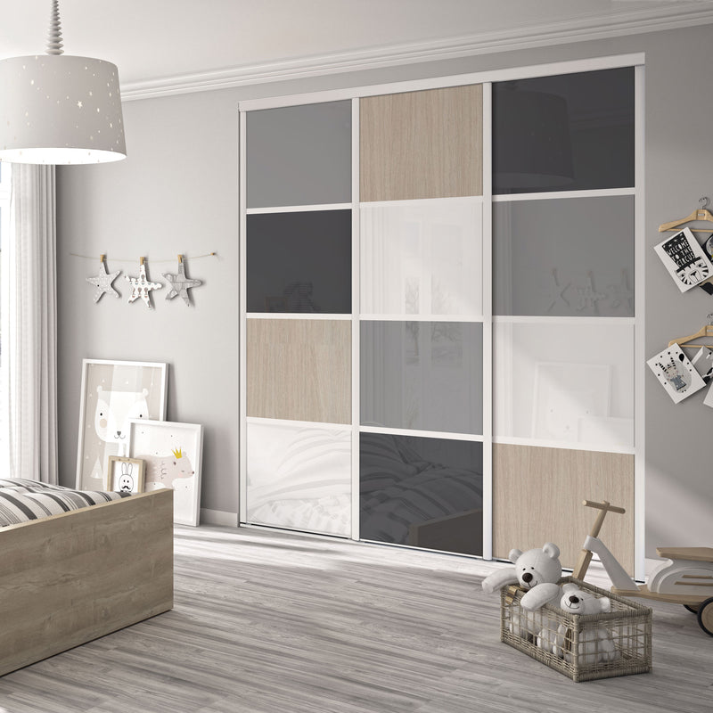 Façade de placard coulissante 3 portes verre laqué gris perle, verre laqué gris foncé, décor chêne naturel, verre laqué blanc pur