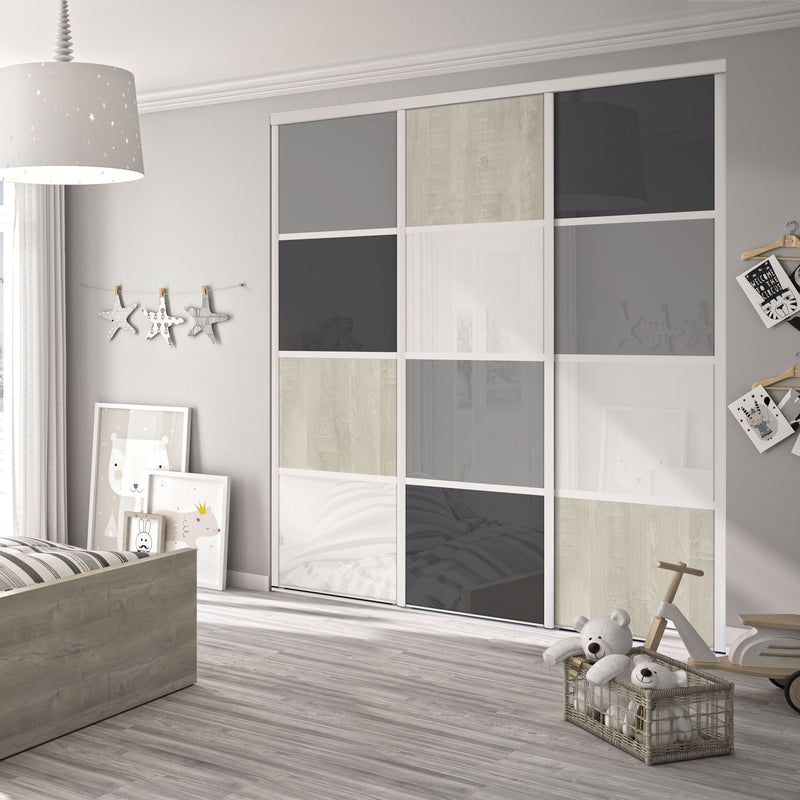 Façade de placard coulissante 3 portes verre laqué gris perle, verre laqué gris foncé, décor chêne blond, verre laqué blanc pur