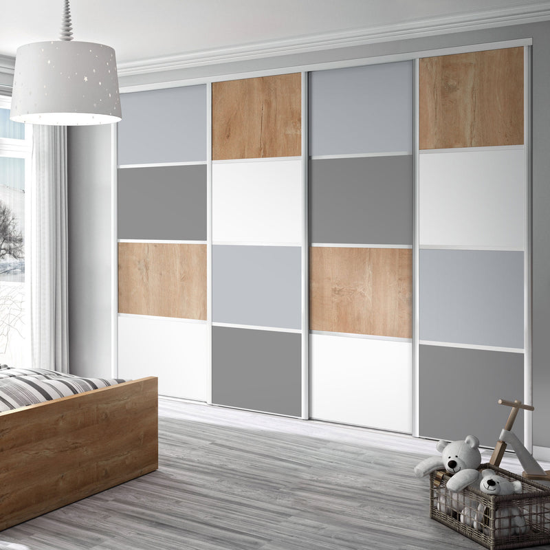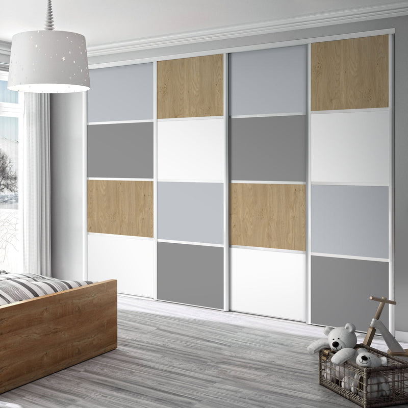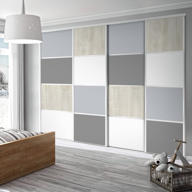 Façade de placard coulissante 4 portes décor gris galet, décor gris intense, décor chêne blond, décor blanc mat