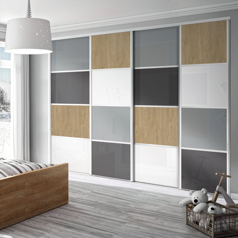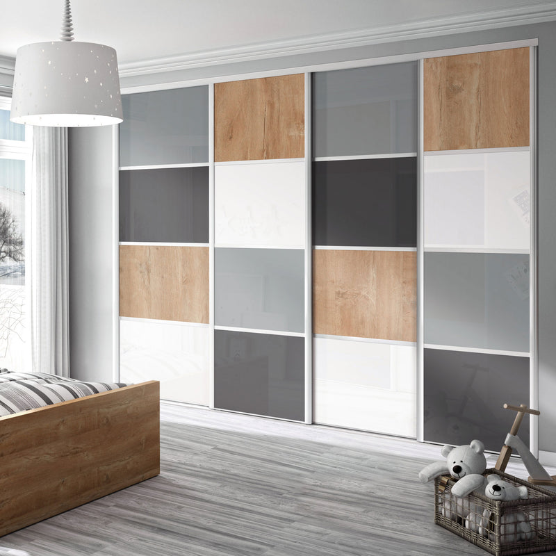 Façade de placard coulissante 4 portes verre laqué gris perle, verre laqué gris foncé, décor chêne naturel, verre laqué blanc pur