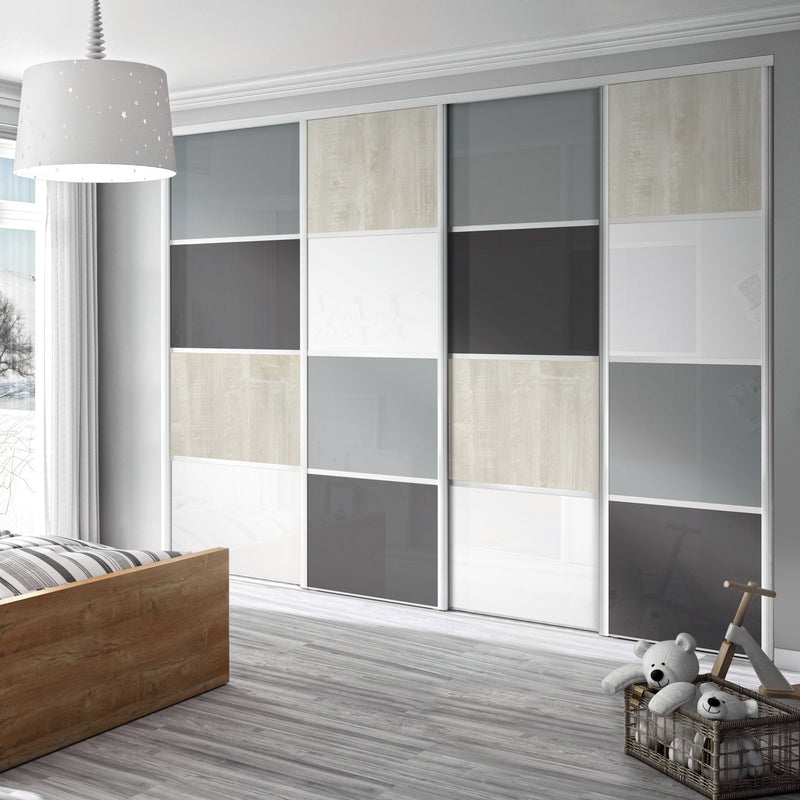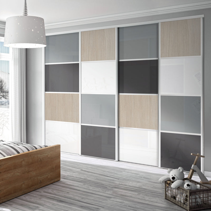 Façade de placard coulissante 4 portes verre laqué gris perle, verre laqué gris foncé, décor chêne blond, verre laqué blanc pur