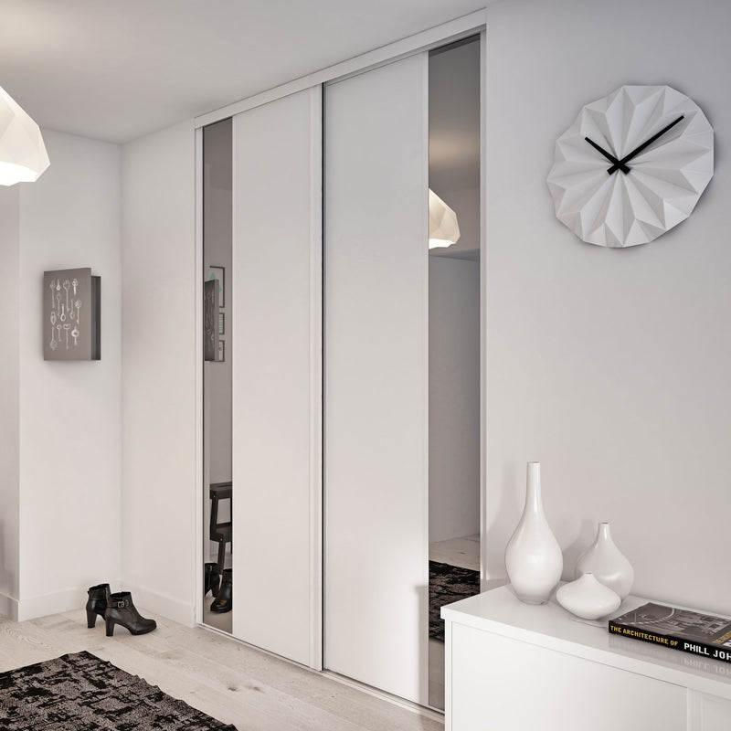 Façade de placard coulissante 2 portes décor blanc mat, miroir argent