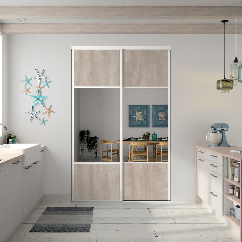 Façade de placard coulissante 4 portes décor bois flotté crème, miroir argent