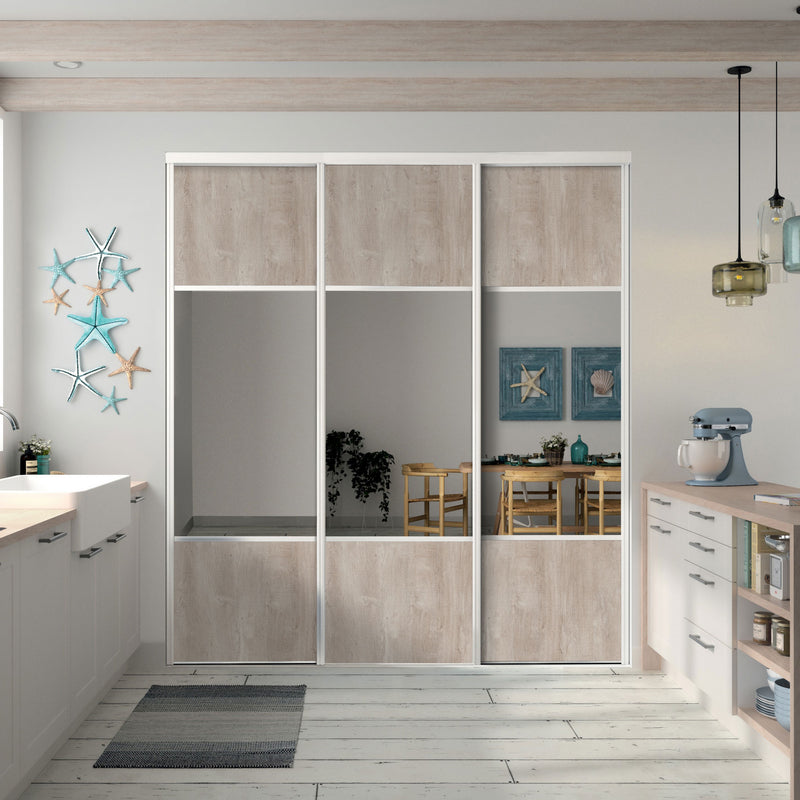 Façade de placard coulissante 3 portes décor chêne flanelle brut, miroir argent