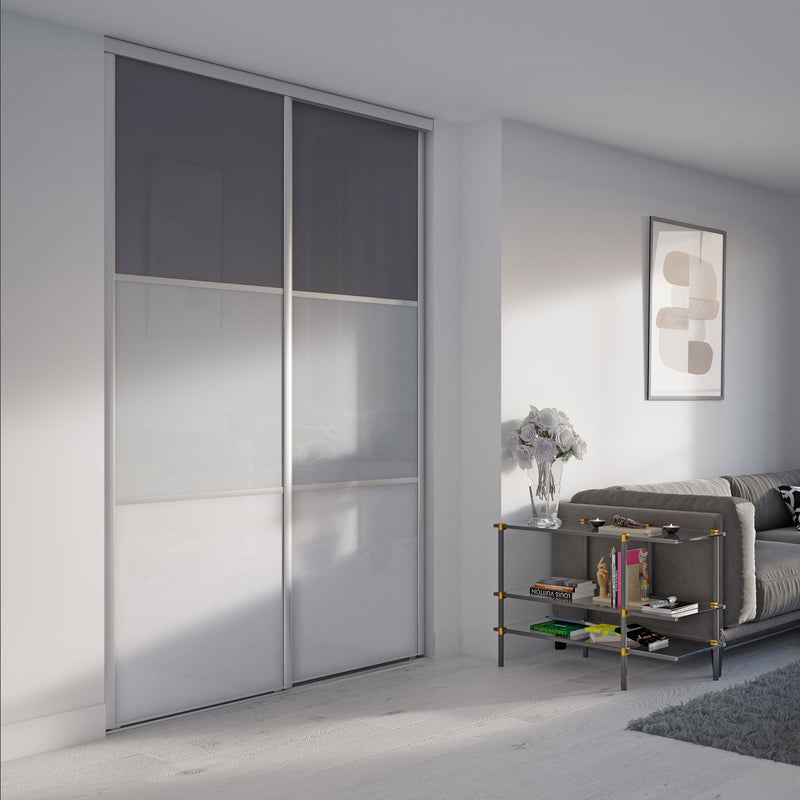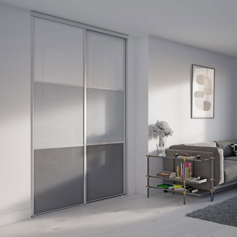 Façade de placard coulissante 2 portes verre laqué blanc pur, verre laqué gris perle, verre laqué gris foncé