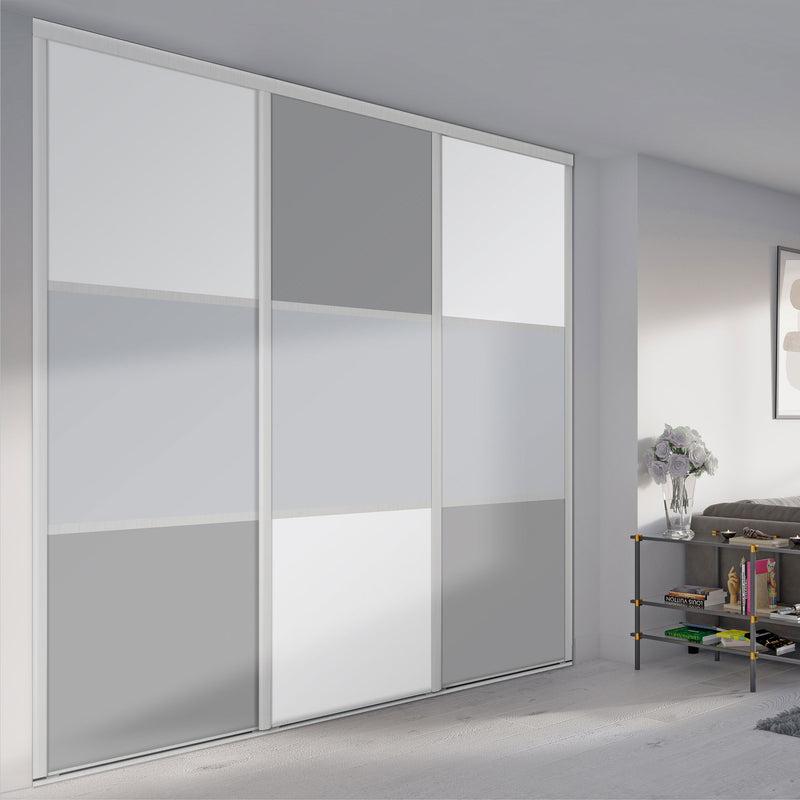 Façade de placard coulissante 3 portes verre laqué blanc pur, verre laqué gris perle, verre laqué gris foncé