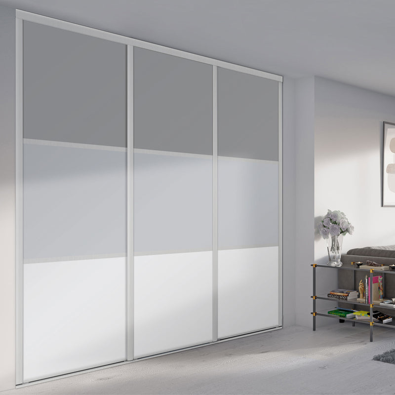 Façade de placard coulissante 3 portes verre laqué gris foncé, verre laqué gris perle, verre laqué blanc pur