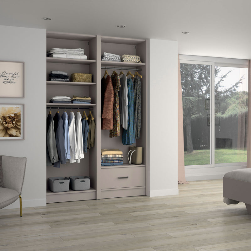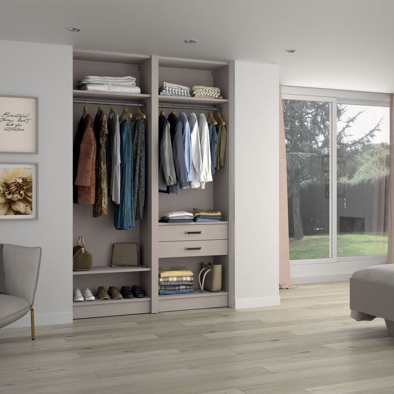 Aménagement 2 espaces, profondeur 465 mm, Moka, 2 tringles - 4 étagères - 2 tiroirs