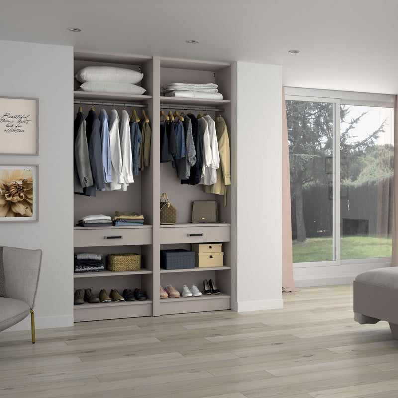 Aménagement 2 espaces, profondeur 465 mm, Moka, 2 tringles - 6 étagères - 2 tiroirs