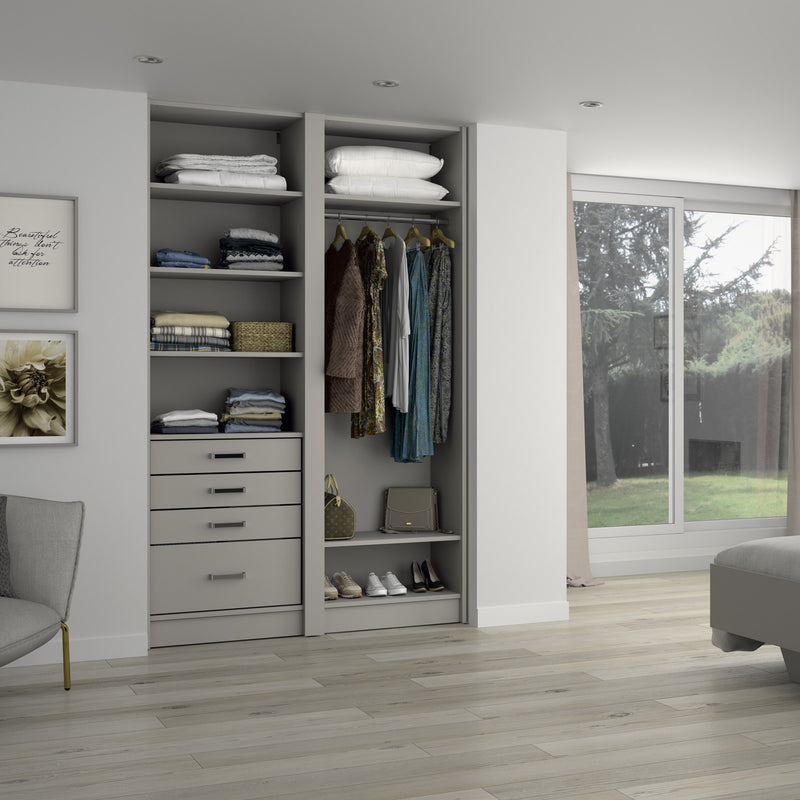 Aménagement 2 espaces, profondeur 550 mm, Moka, 1 tringle - 6 étagères - 4 tiroirs
