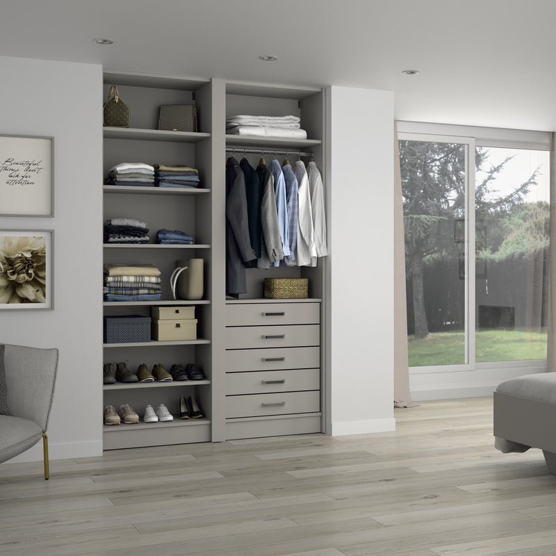 Aménagement 2 espaces, profondeur 550 mm, Moka, 1 tringle - 8 étagères - 5 tiroirs