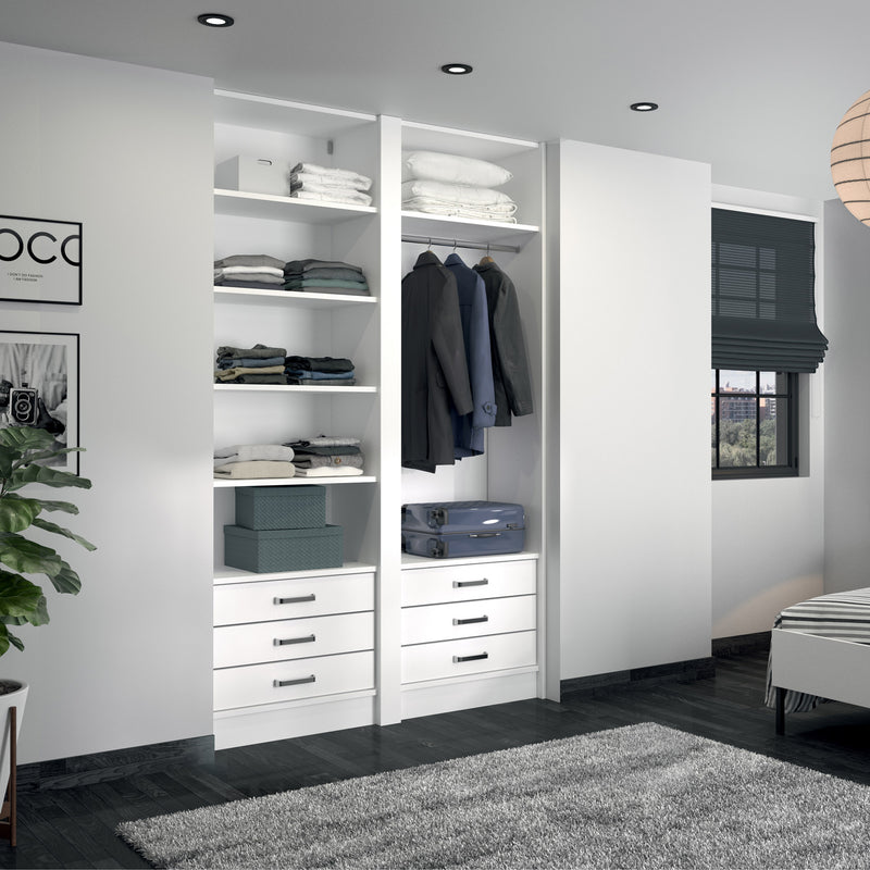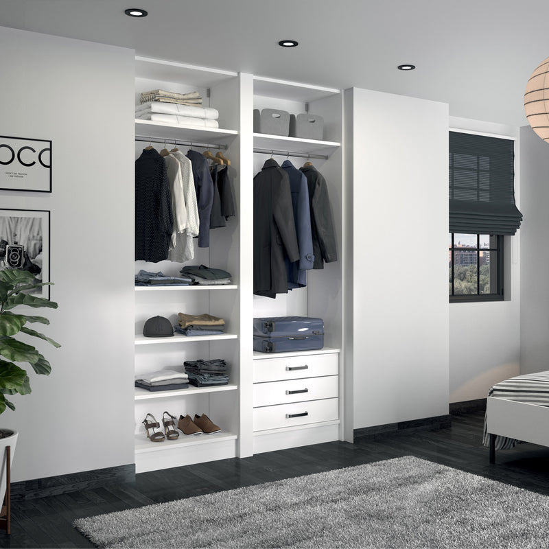 Aménagement 2 espaces, profondeur 550 mm, Blanc Mat, 2 tringles - 6 étagères - 3 tiroirs