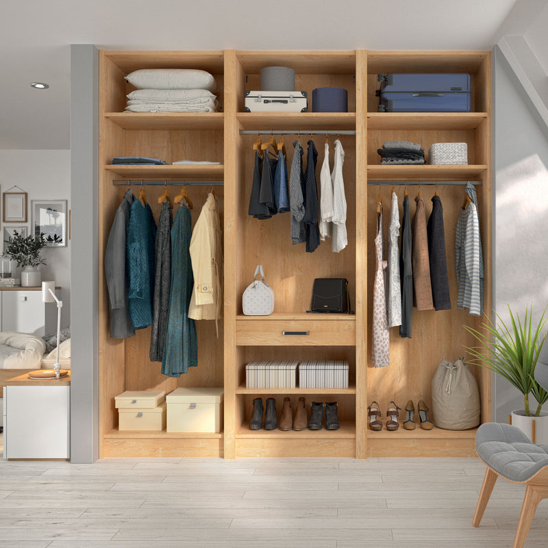 Aménagement 3 espaces, profondeur 465 mm, Chêne Blond, 3 tringles - 7 étagères - 1 tiroir