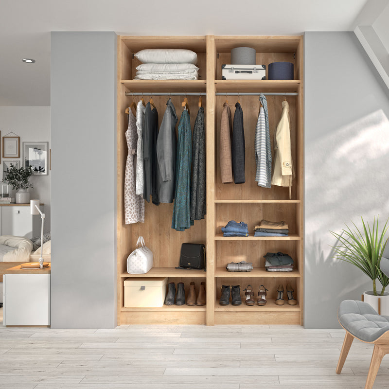Aménagement 2 espaces, profondeur 550 mm, Chêne Blond, 2 tringles - 4 étagères - 2 tiroirs