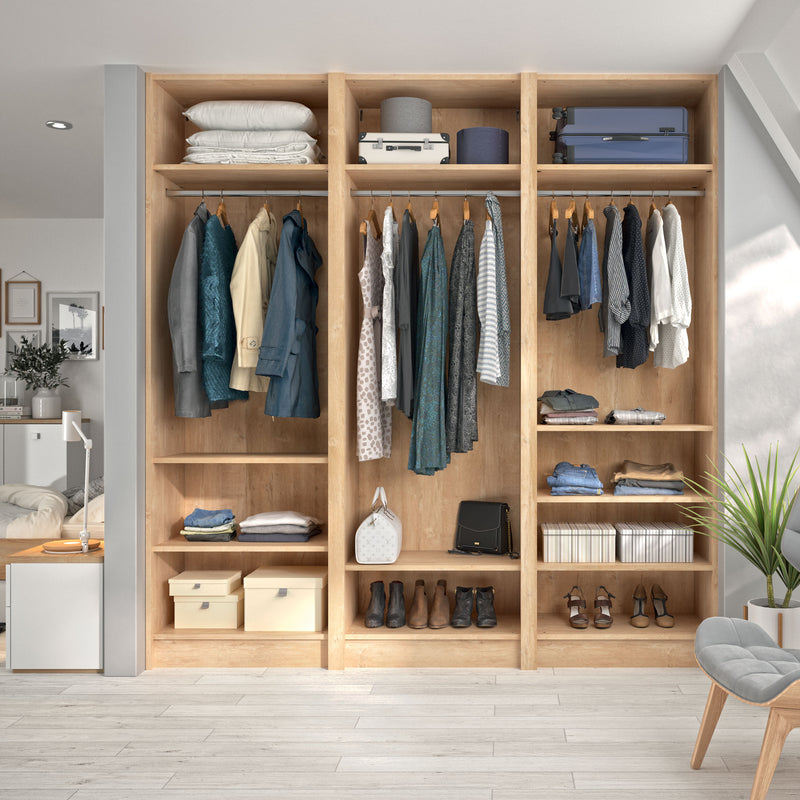 Aménagement 3 espaces, profondeur 550 mm, Chêne Blond, 3 tringles - 8 étagères