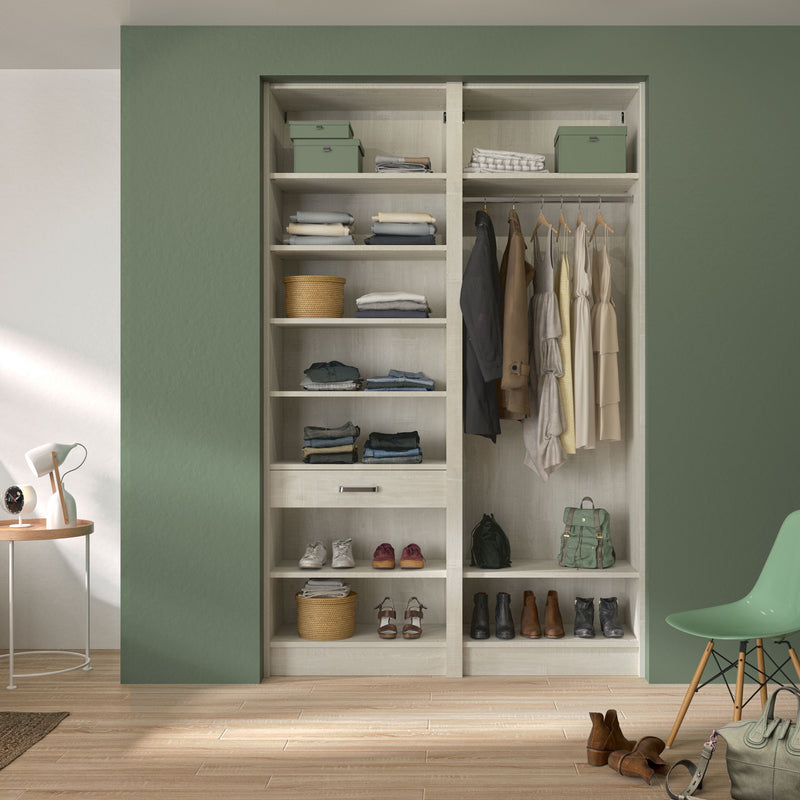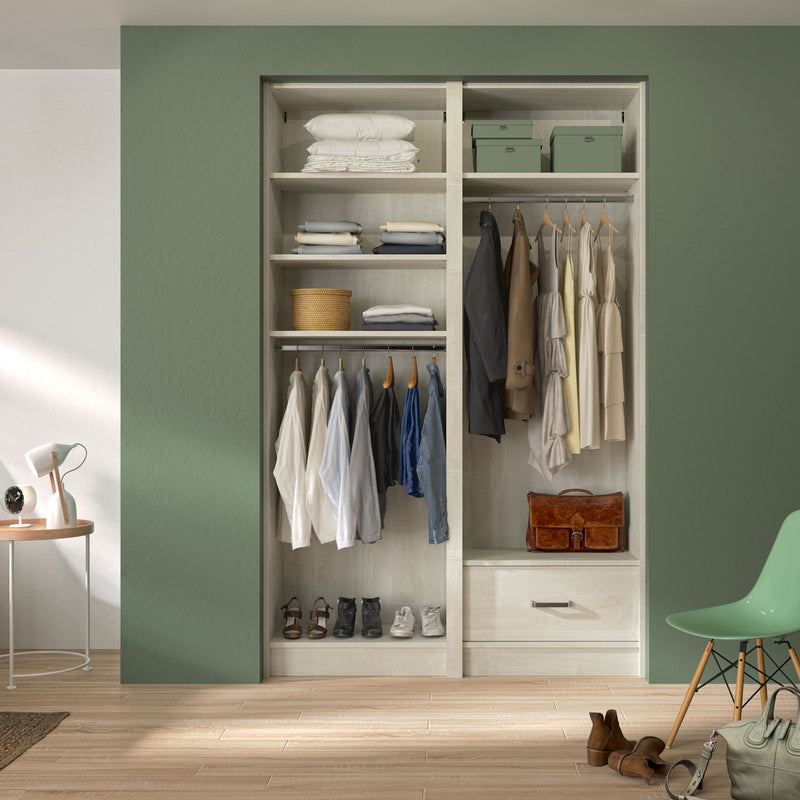 Aménagement 2 espaces, profondeur 550 mm, Bois Flotté Crème, 2 tringles - 4 étagères - 2 tiroirs