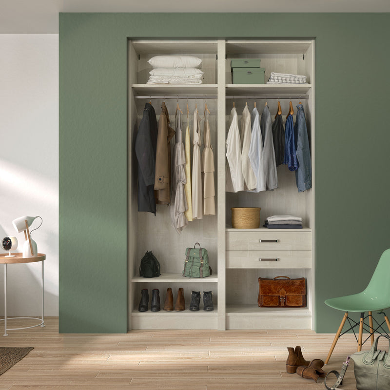 Aménagement 2 espaces, profondeur 465 mm, Bois Flotté Crème, 2 tringles - 4 étagères - 2 tiroirs
