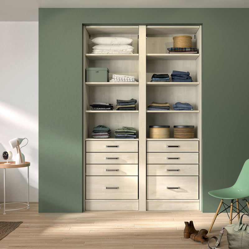 Aménagement 2 espaces, profondeur 465 mm, Bois Flotté Crème, - 8 étagères - 8 tiroirs