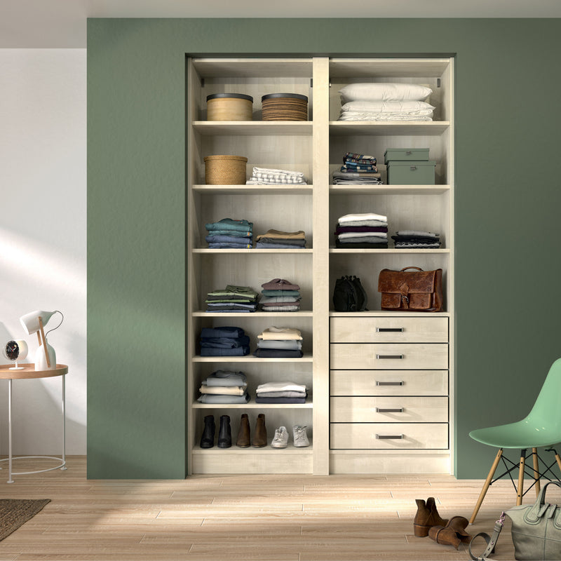 Aménagement 2 espaces, profondeur 465 mm, Bois Flotté Crème, - 10 étagères - 5 tiroirs