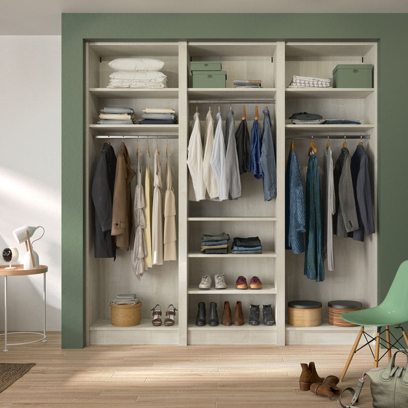 Aménagement 3 espaces, profondeur 550 mm, Bois Flotté Crème, 3 tringles - 8 étagères