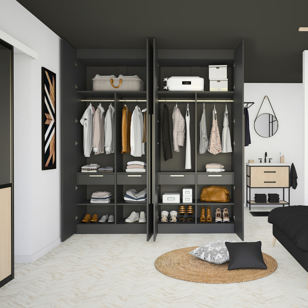 Cet aménagement est composé de 4 tringles, 10 étagères et 4 tiroirs. Son décor Graphite, élégant et intemporel, s’intégrera parfaitement à votre déco. Il s’harmonise avec tous les produits Kazed. Les poignées en aluminium brossé Naturel lui confèrent un charme unique.