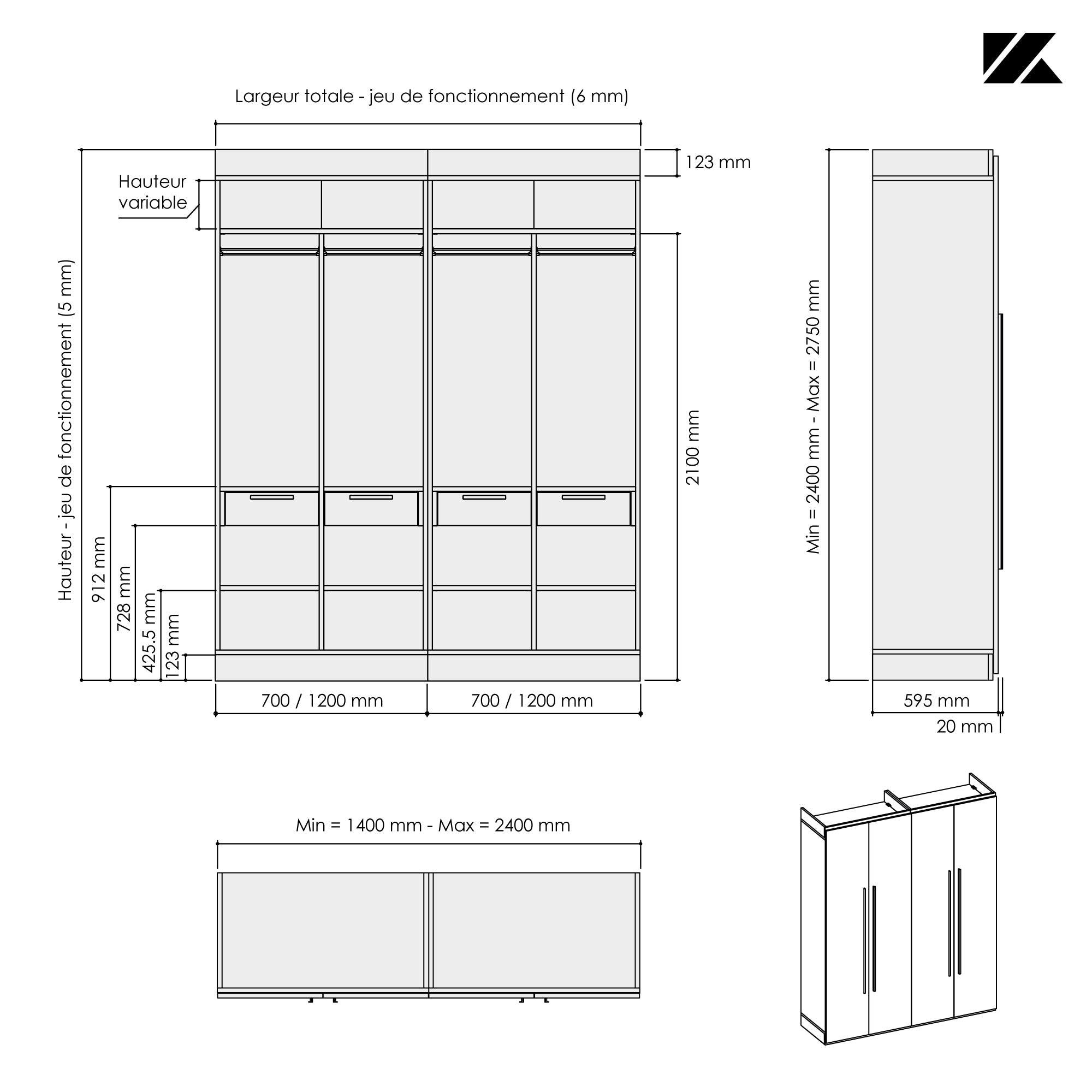 Ce dressing 4 espaces avec portes battantes toute hauteur Kazed trouvera facilement sa place dans votre pièce quelque soit l’espace disponible grâce à son option de mise à dimensions. Sa largeur et sa hauteur sont ajustables au mm près lui permettant de se glisser en intérieur ou en extérieur de niche. Sa profondeur de 595 mm (portes comprises) est fixe.