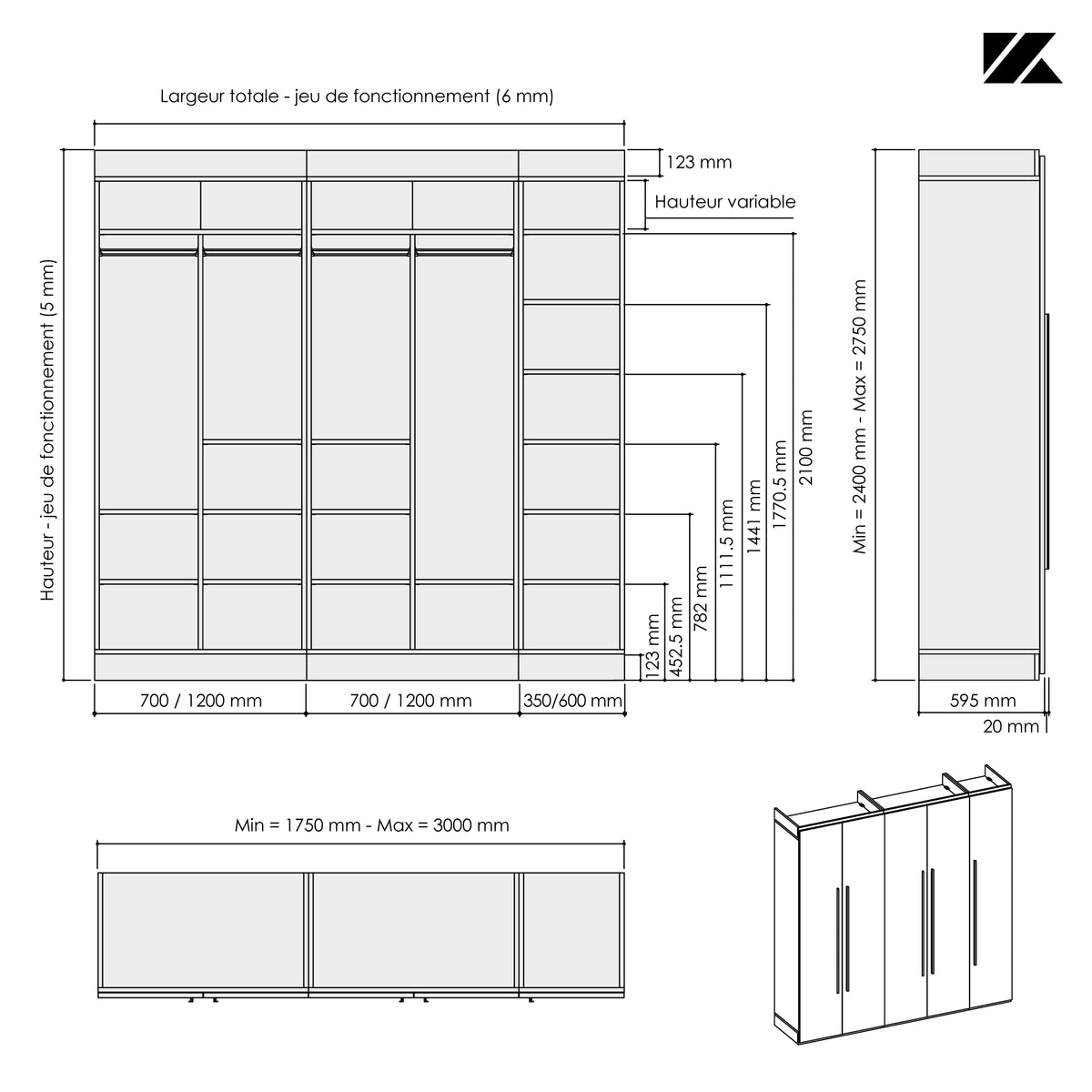 Ce dressing 5 espaces avec portes battantes toute hauteur Kazed trouvera facilement sa place dans votre pièce quelque soit l’espace disponible grâce à son option de mise à dimensions. Sa largeur et sa hauteur sont ajustables au mm près lui permettant de se glisser en intérieur ou en extérieur de niche. Sa profondeur de 595 mm (portes comprises) est fixe.