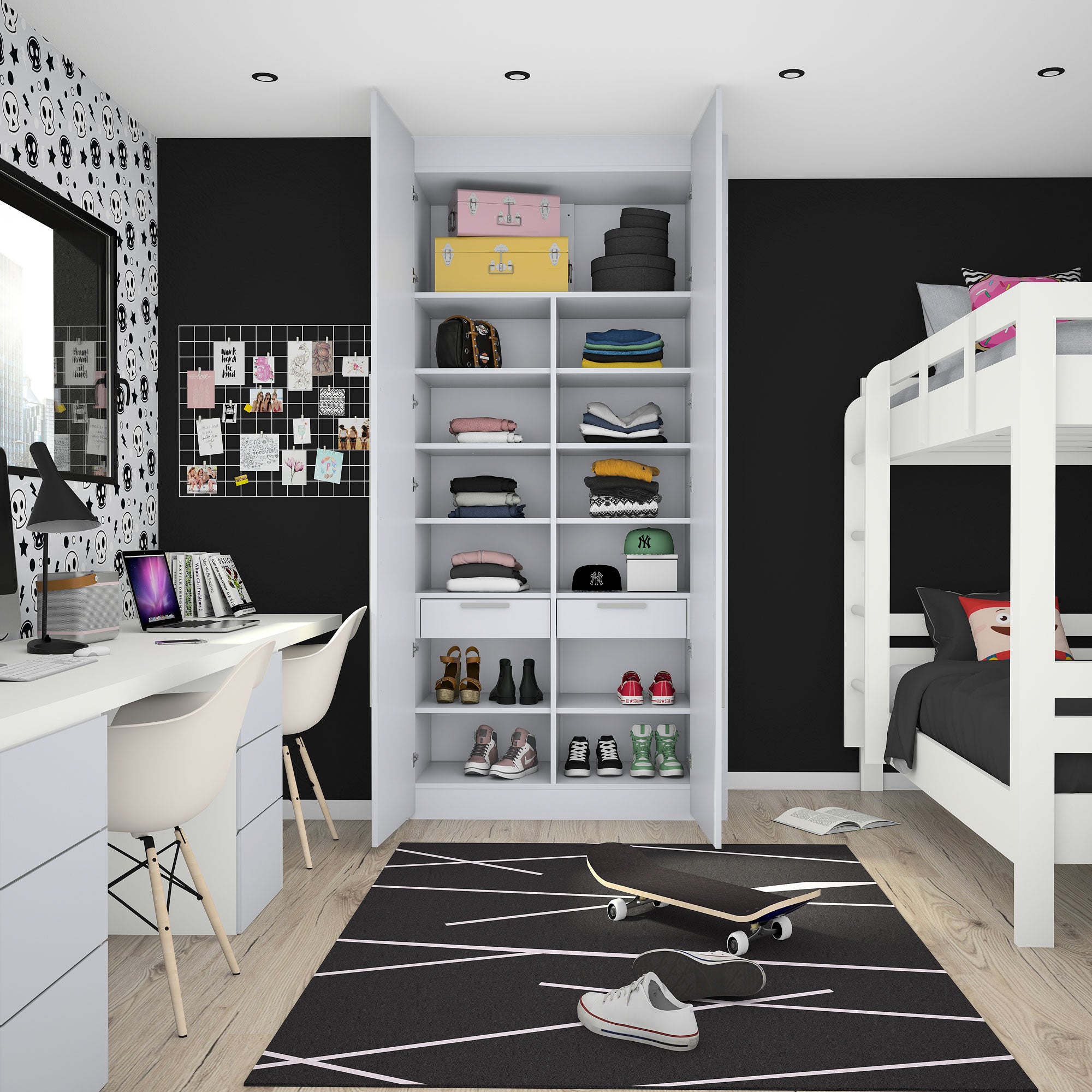 Ce dressing 2 espaces avec portes battantes toute hauteur Kazed trouvera facilement sa place dans votre pièce quelque soit l’espace disponible grâce à son option de mise à dimensions. Sa largeur et sa hauteur sont ajustables au mm près lui permettant de se glisser en intérieur ou en extérieur de niche. Sa profondeur de 595 mm (portes comprises) est fixe.