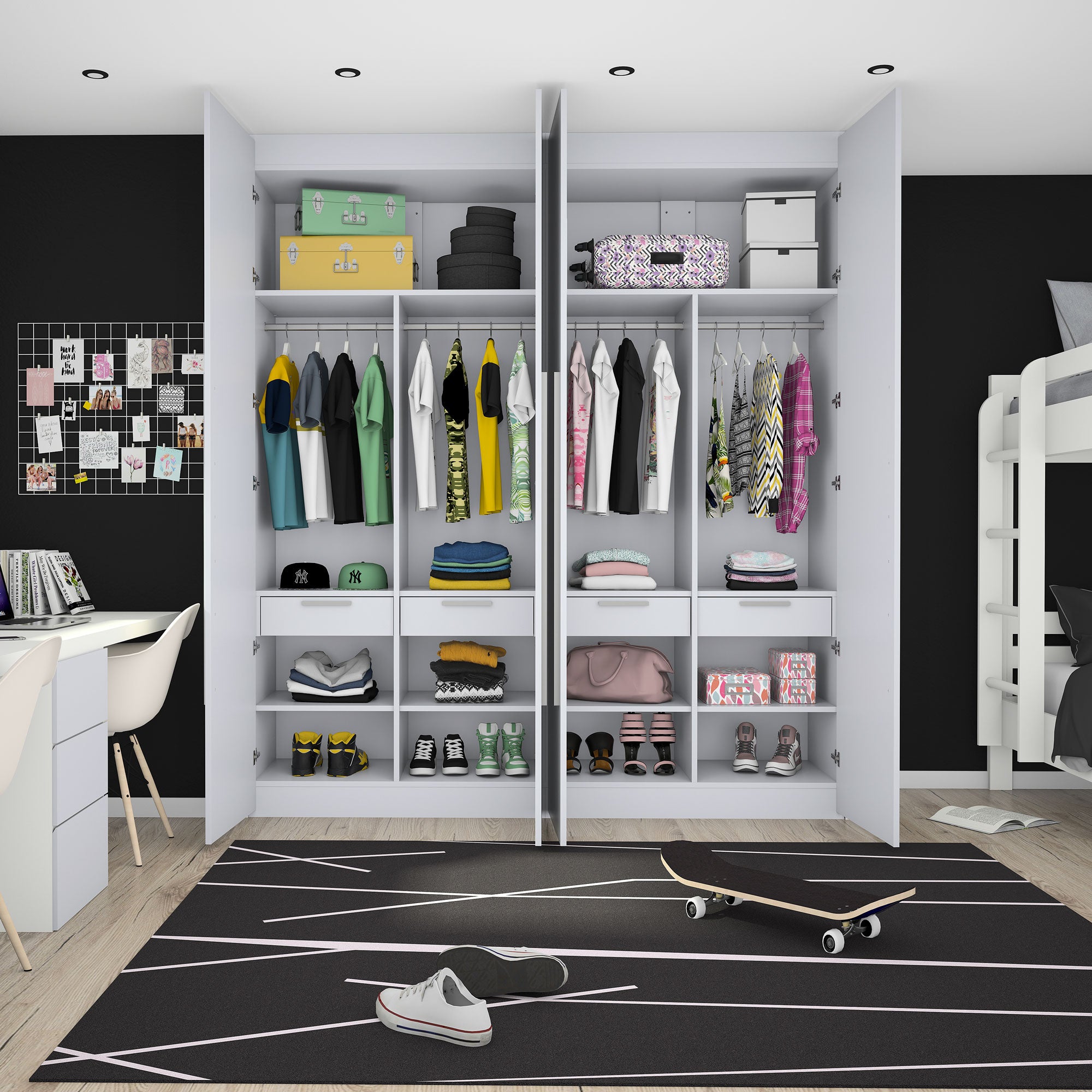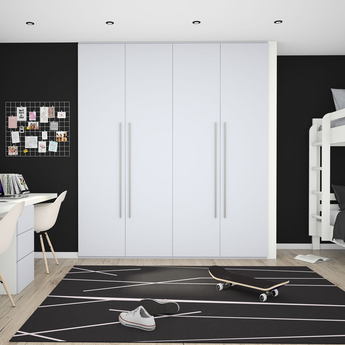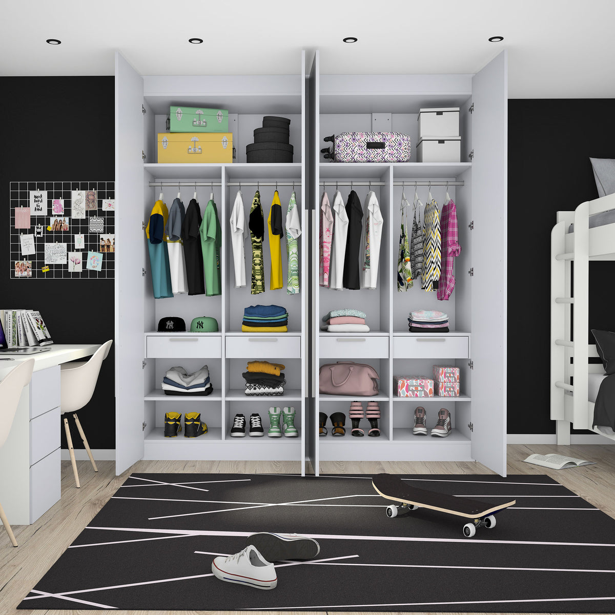 Ce dressing 4 espaces avec portes battantes toute hauteur Kazed trouvera facilement sa place dans votre pièce quelque soit l’espace disponible grâce à son option de mise à dimensions. Sa largeur et sa hauteur sont ajustables au mm près lui permettant de se glisser en intérieur ou en extérieur de niche. Sa profondeur de 595 mm (portes comprises) est fixe.