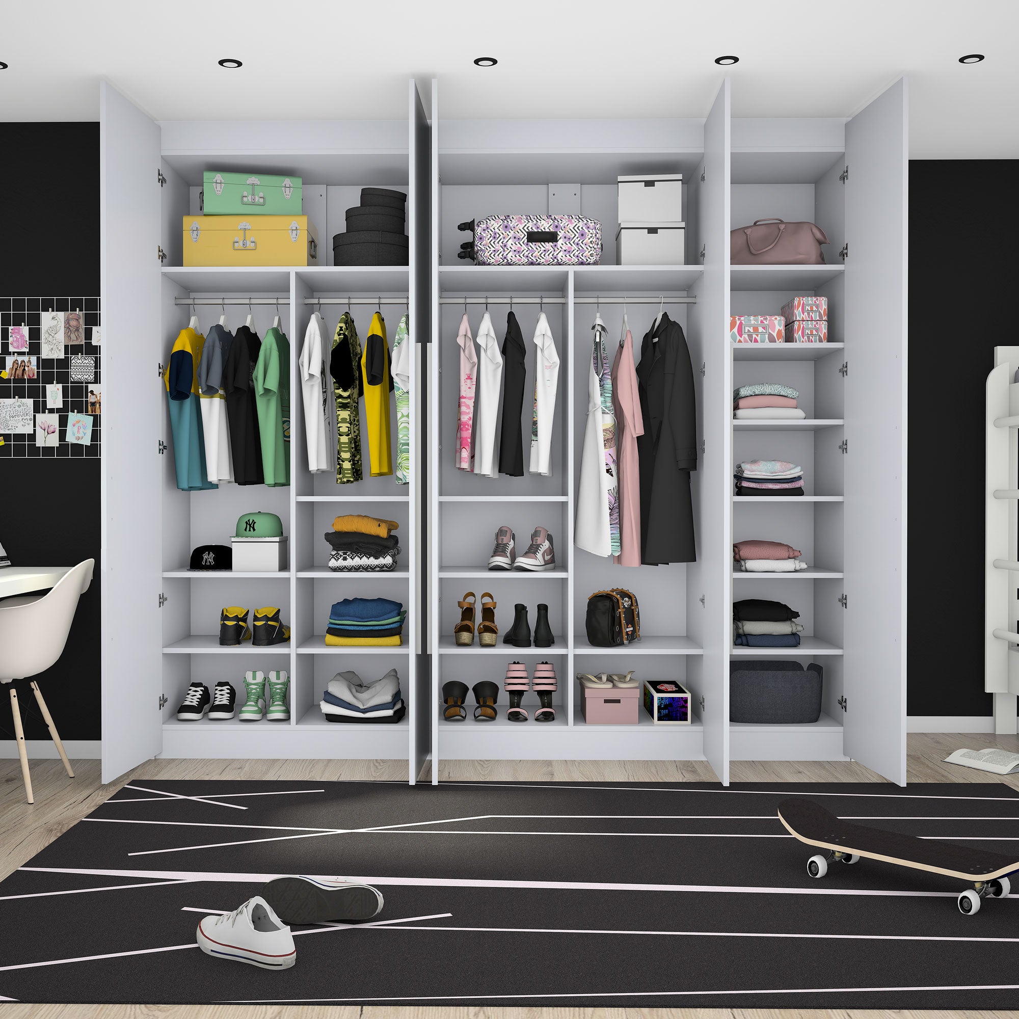Ce dressing 5 espaces avec portes battantes toute hauteur Kazed trouvera facilement sa place dans votre pièce quelque soit l’espace disponible grâce à son option de mise à dimensions. Sa largeur et sa hauteur sont ajustables au mm près lui permettant de se glisser en intérieur ou en extérieur de niche. Sa profondeur de 595 mm (portes comprises) est fixe.