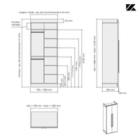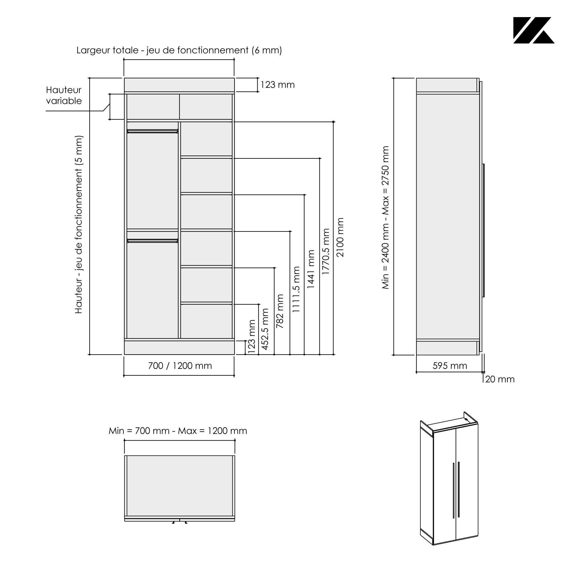 Ce dressing 2 espaces avec portes battantes toute hauteur Kazed trouvera facilement sa place dans votre pièce quelque soit l’espace disponible grâce à son option de mise à dimensions. Sa largeur et sa hauteur sont ajustables au mm près lui permettant de se glisser en intérieur ou en extérieur de niche. Sa profondeur de 595 mm (portes comprises) est fixe.