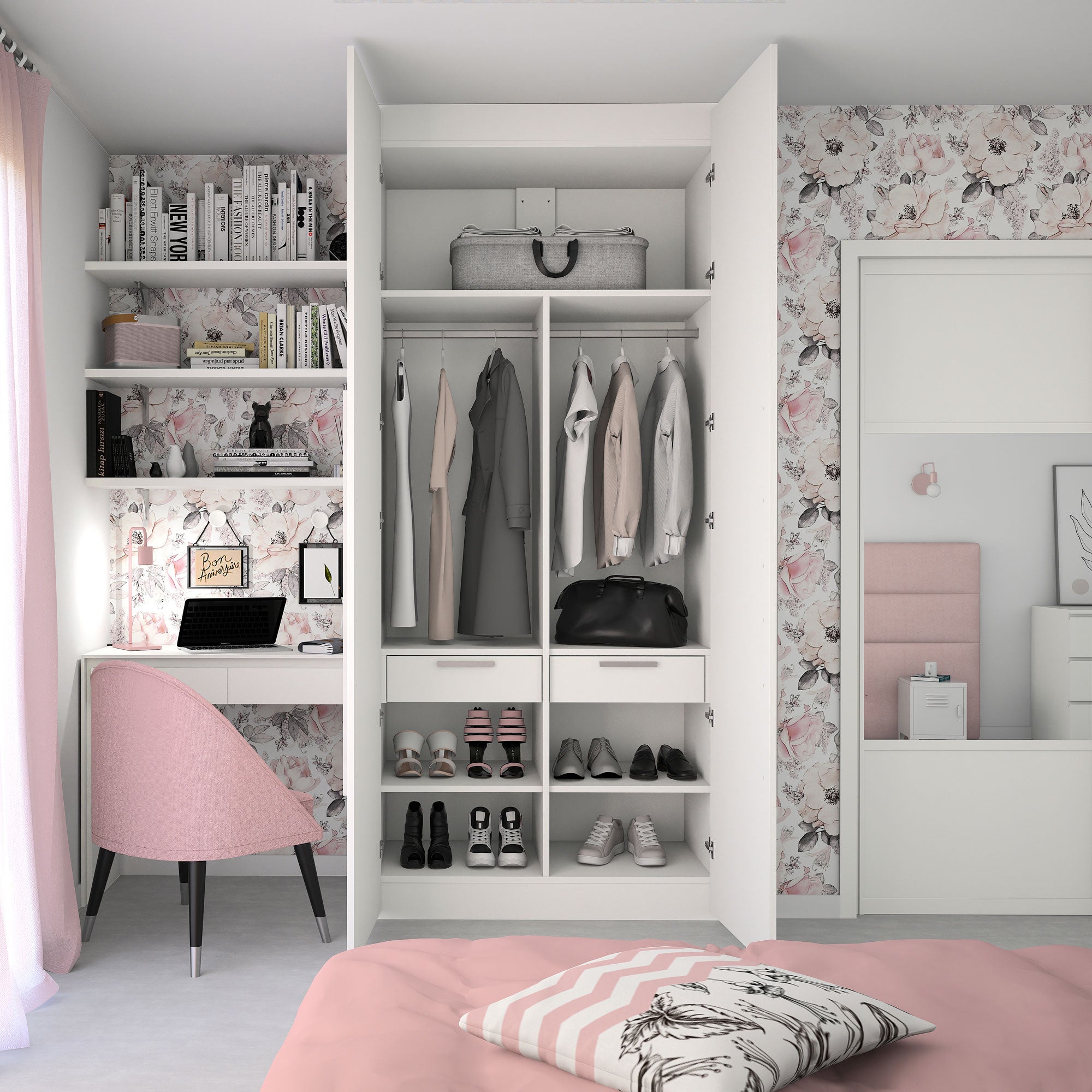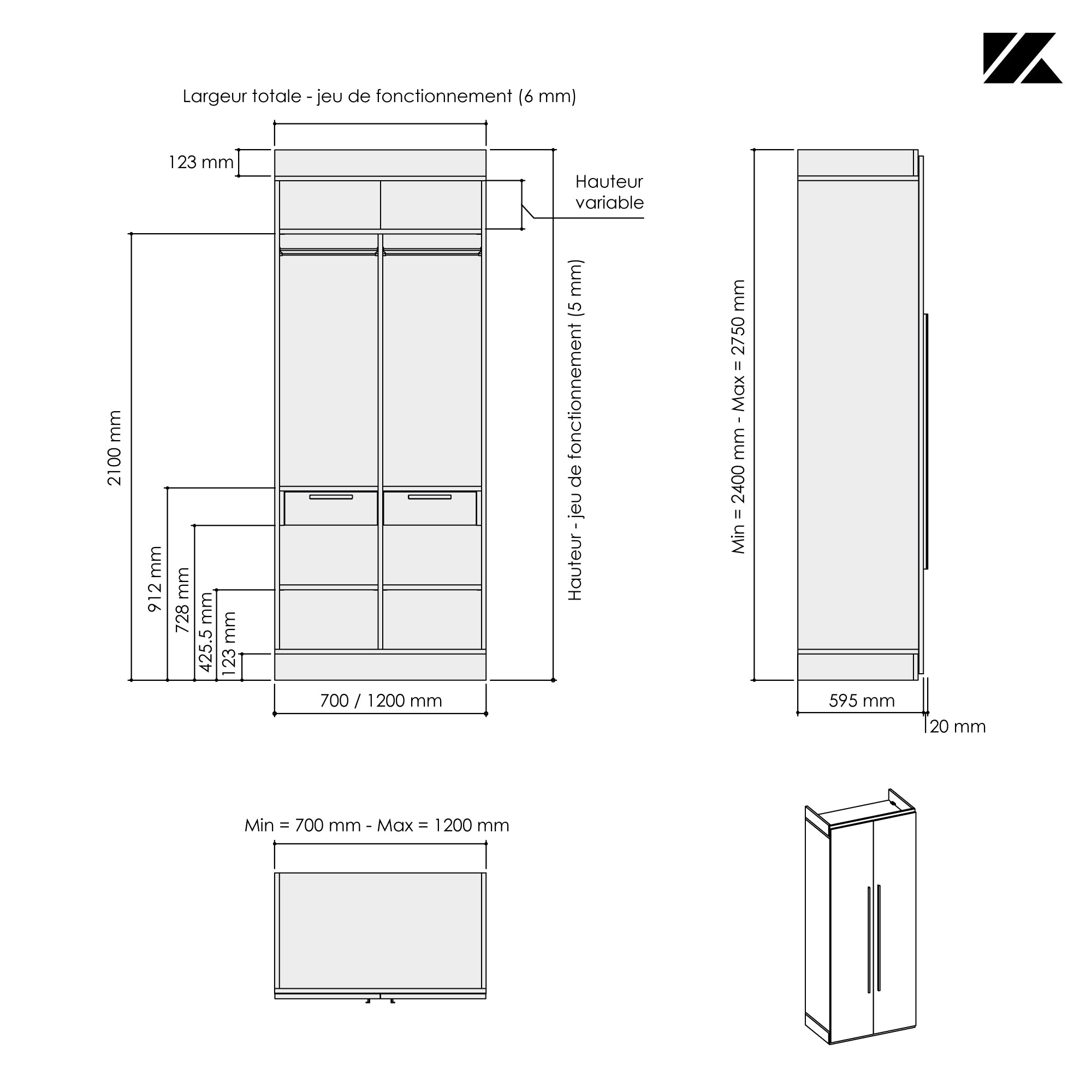Ce dressing 2 espaces avec portes battantes toute hauteur Kazed trouvera facilement sa place dans votre pièce quelque soit l’espace disponible grâce à son option de mise à dimensions. Sa largeur et sa hauteur sont ajustables au mm près lui permettant de se glisser en intérieur ou en extérieur de niche. Sa profondeur de 595 mm (portes comprises) est fixe.