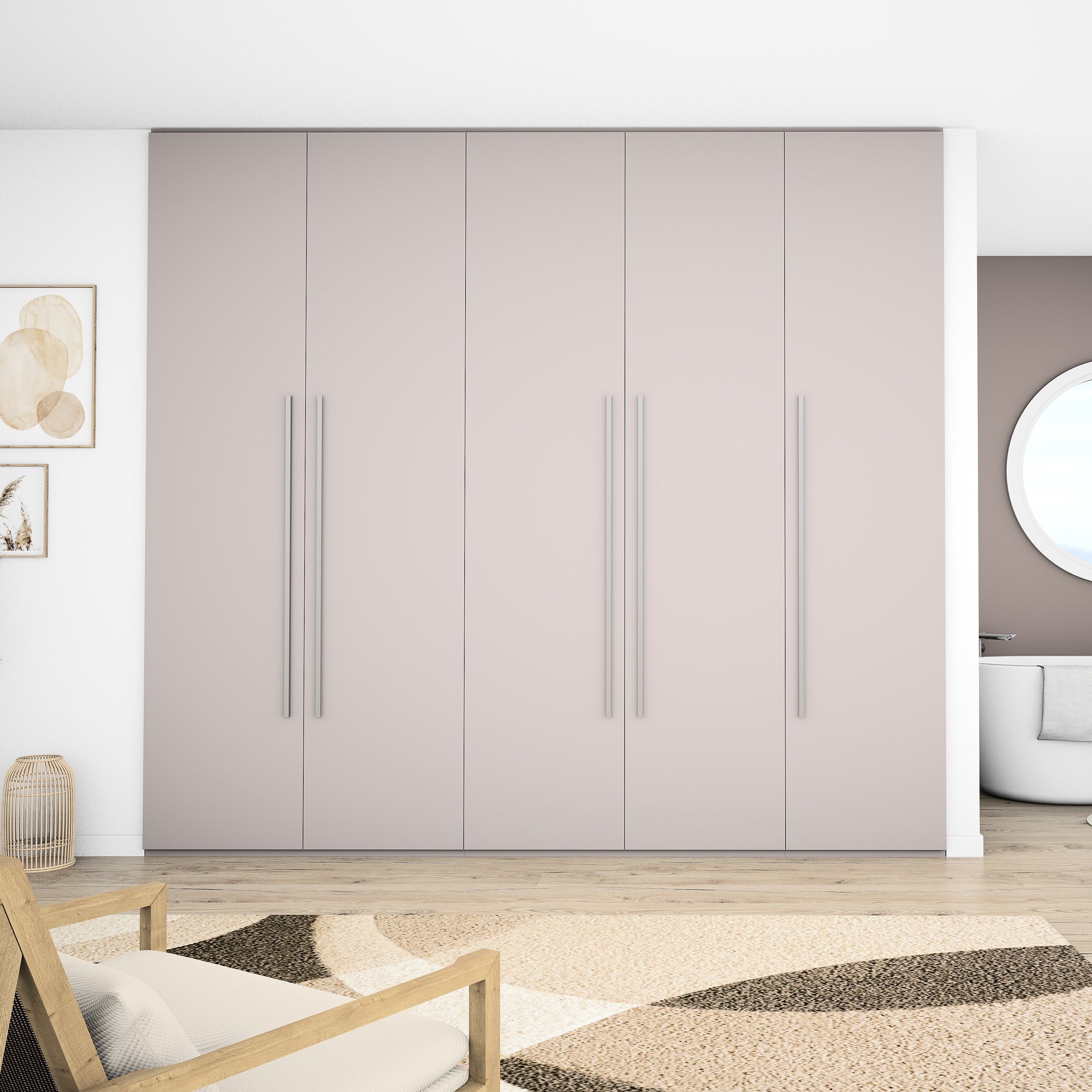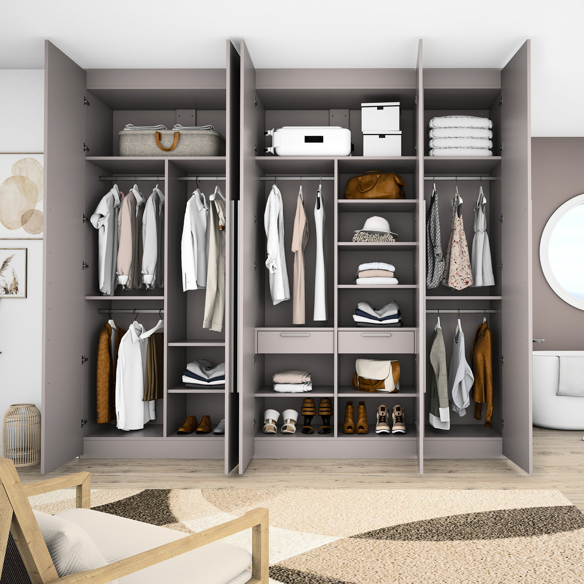 Ce dressing 5 espaces avec portes battantes toute hauteur Kazed trouvera facilement sa place dans votre pièce quelque soit l’espace disponible grâce à son option de mise à dimensions. Sa largeur et sa hauteur sont ajustables au mm près lui permettant de se glisser en intérieur ou en extérieur de niche. Sa profondeur de 595 mm (portes comprises) est fixe.