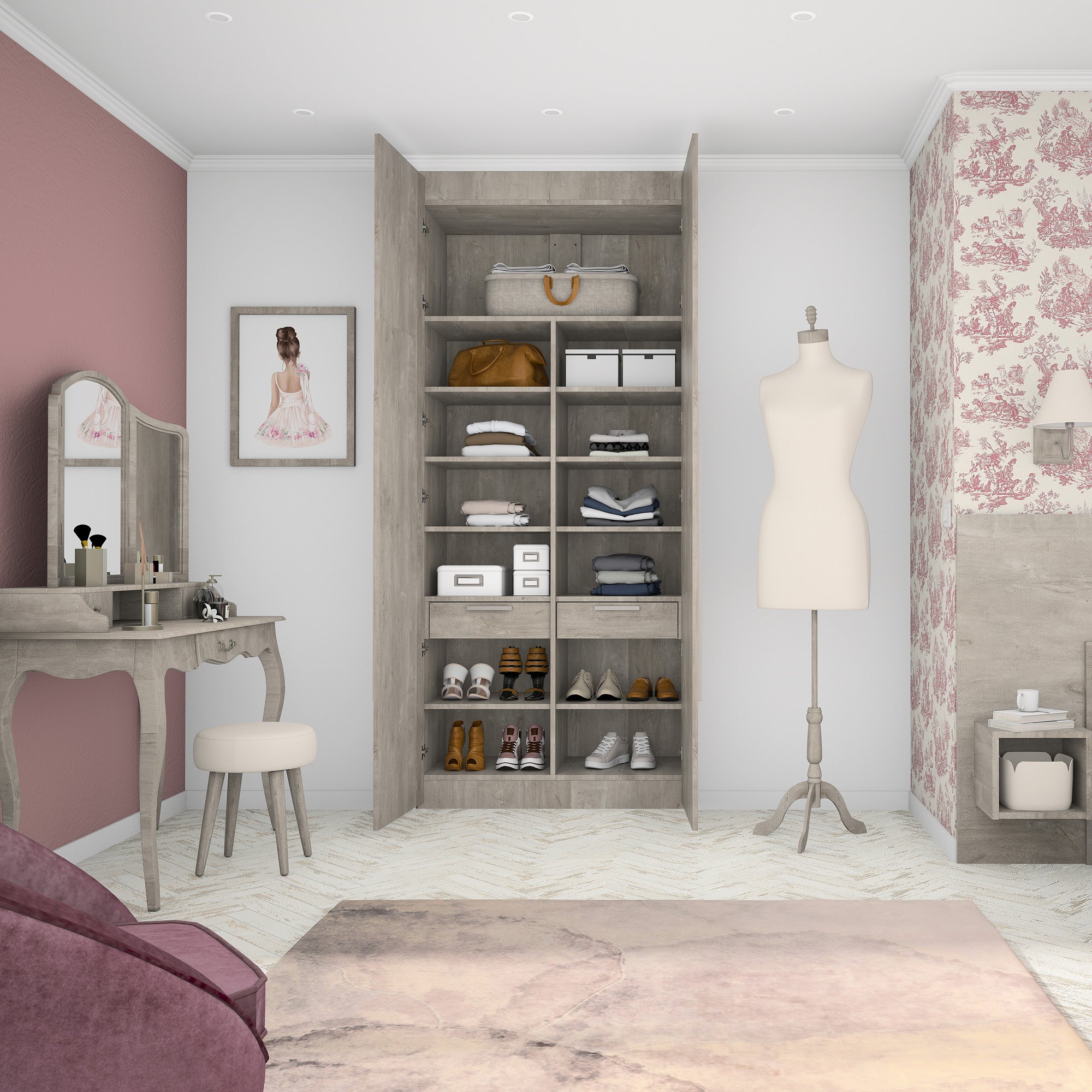 Cet aménagement est composé de 2 tringles, 11 étagères et 2 tiroirs. Son décor Chêne cigare brut, apaisant et chaleureux, s’intégrera parfaitement à votre déco. Il s’harmonise avec tous les produits Kazed. Les poignées en aluminium brossé Naturel lui confèrent un charme unique.