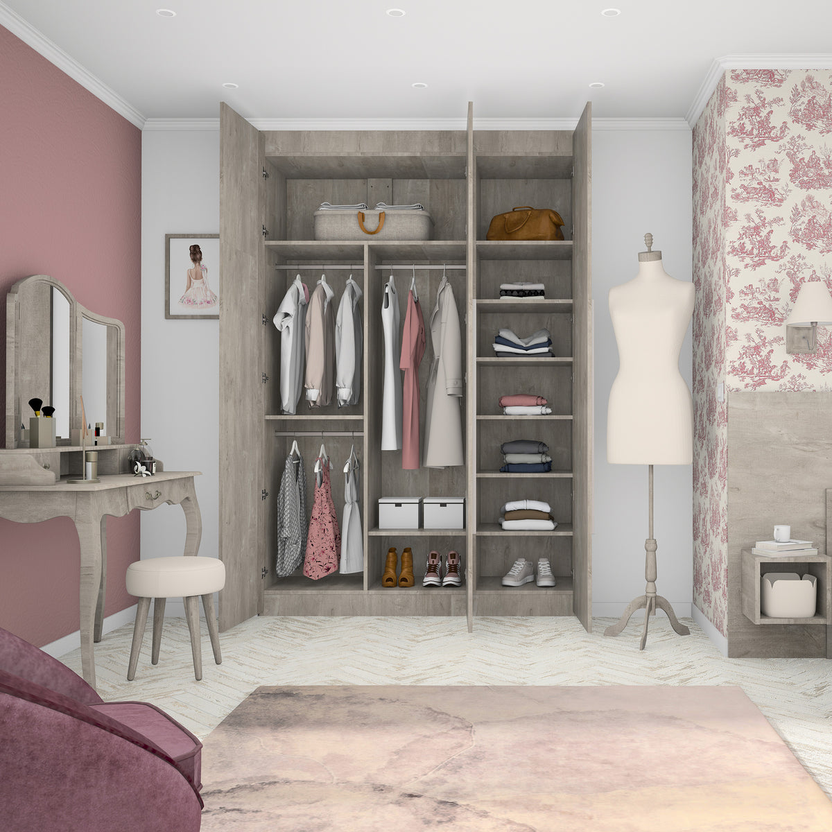 Ce dressing 3 espaces avec portes battantes toute hauteur Kazed trouvera facilement sa place dans votre pièce quelque soit l’espace disponible grâce à son option de mise à dimensions. Sa largeur et sa hauteur sont ajustables au mm près lui permettant de se glisser en intérieur ou en extérieur de niche. Sa profondeur de 595 mm (portes comprises) est fixe.